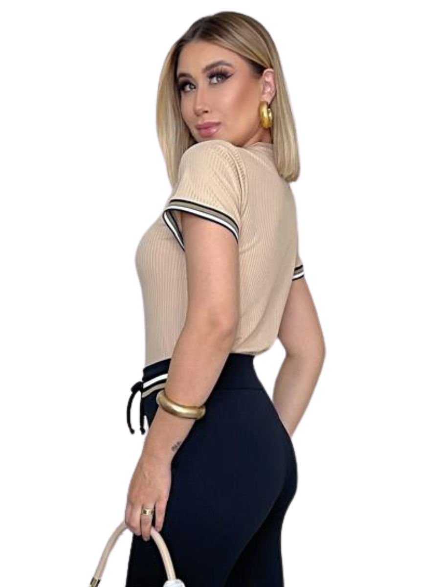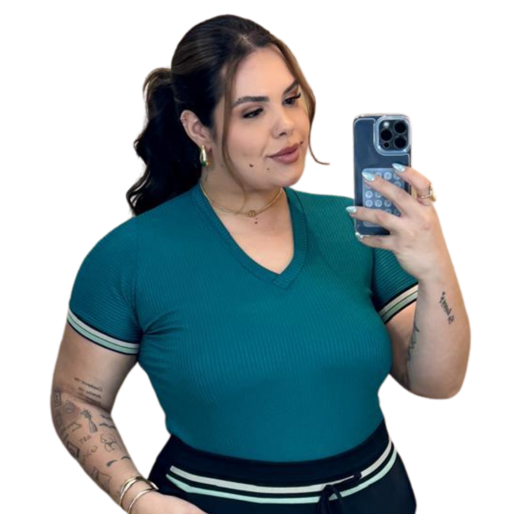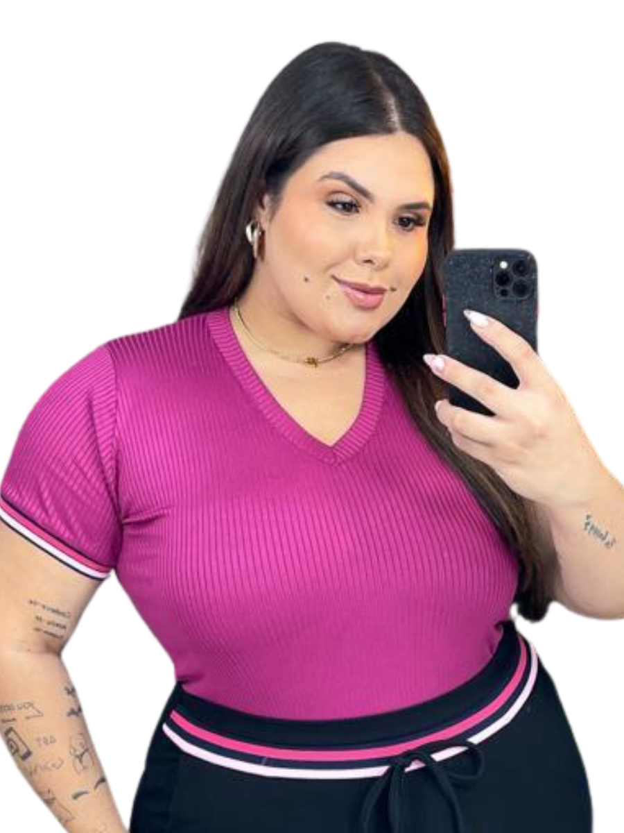 Kit Blusa Feminina Malha Canelada Gola V Manga Curta com Elastano casual dia dia