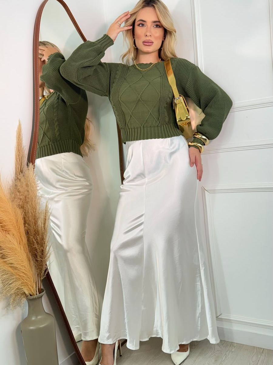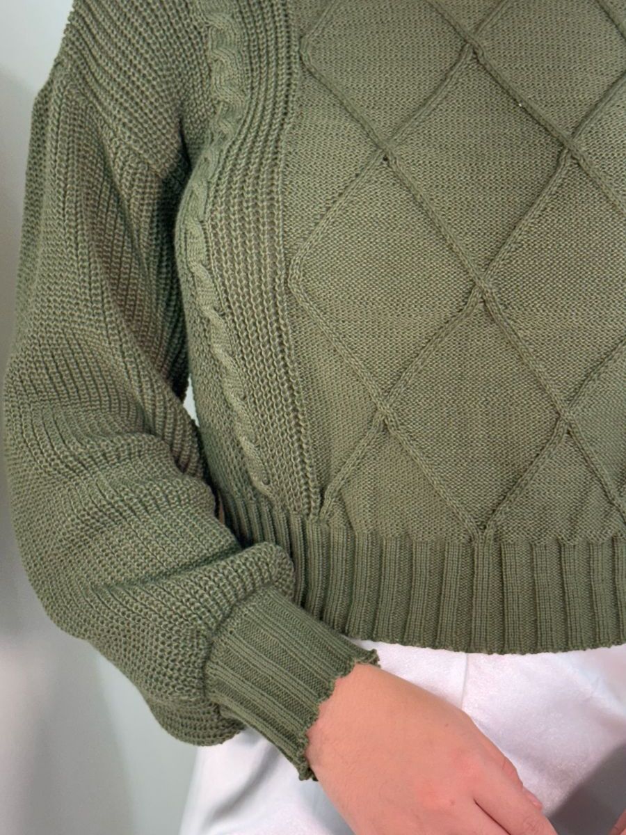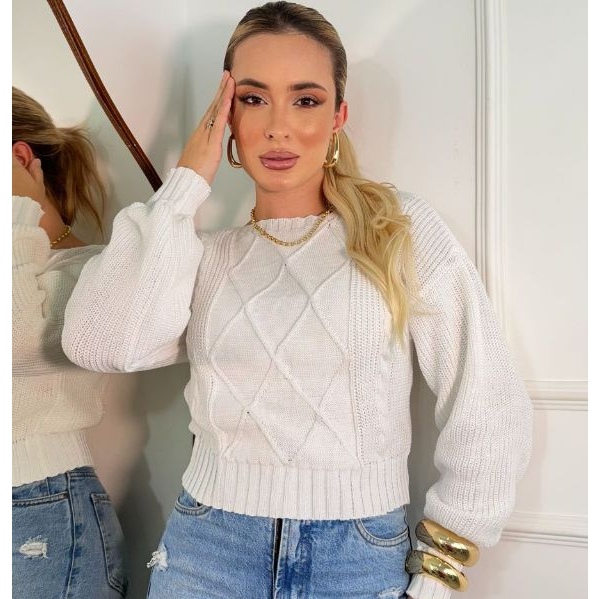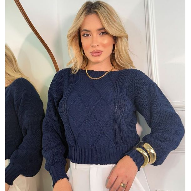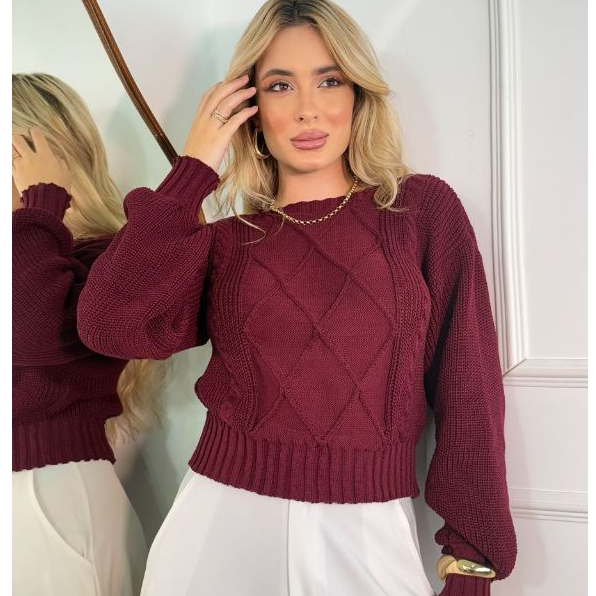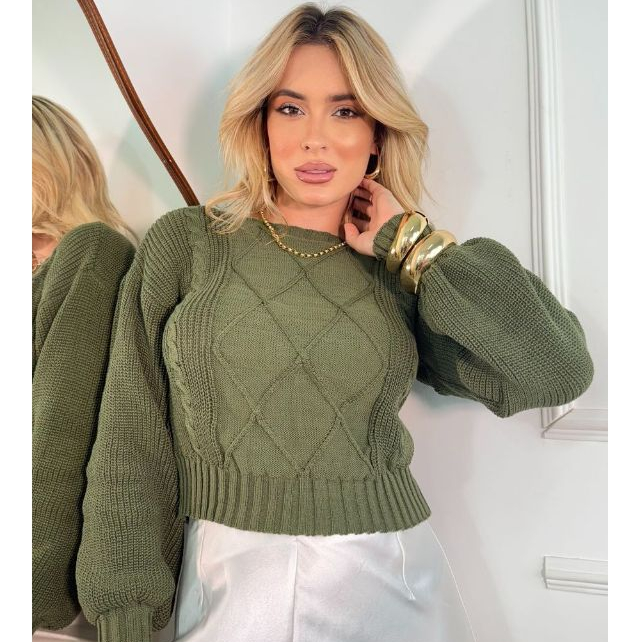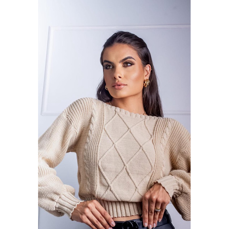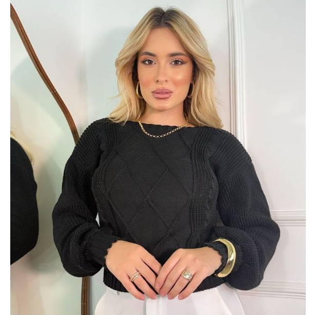 Blusa Tricô Feminina Fang Aran Manga Bufante Moda Tricot Dia a Dia