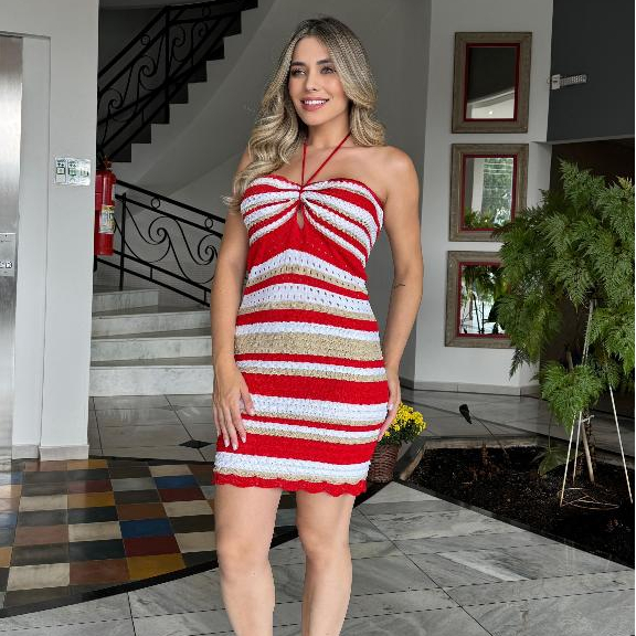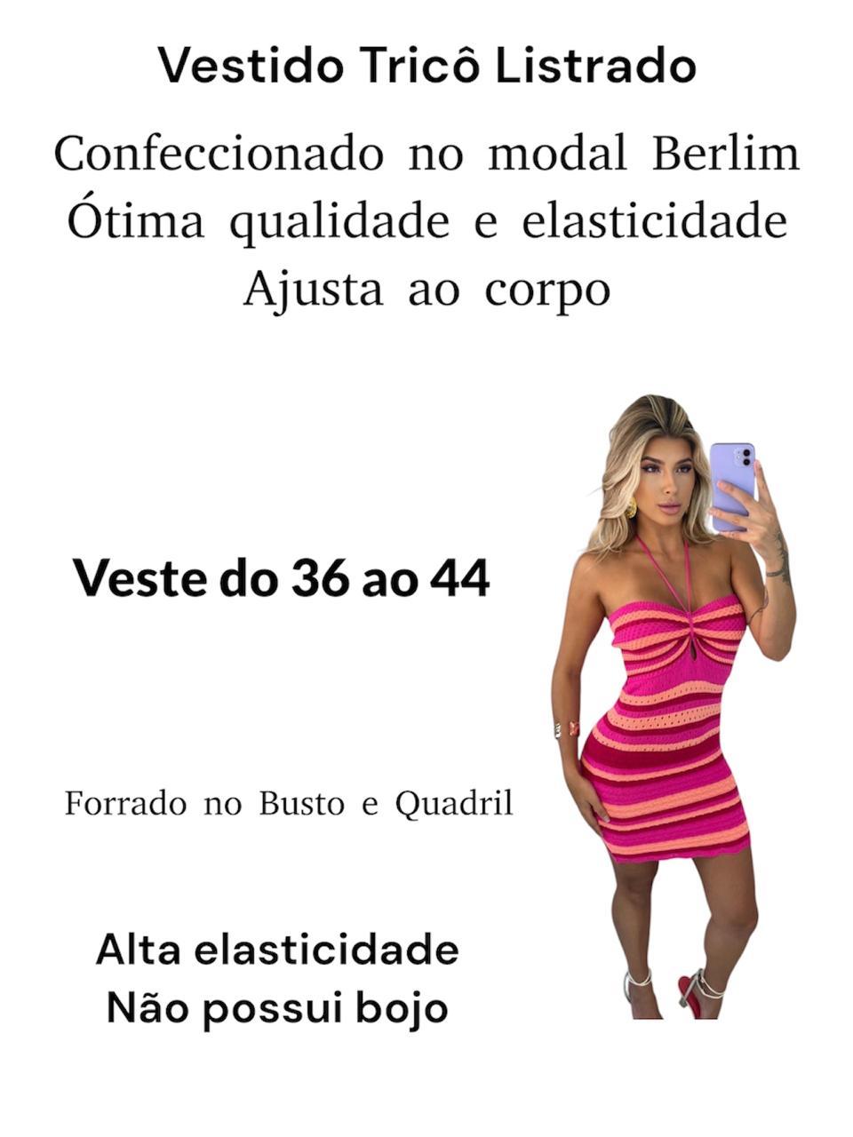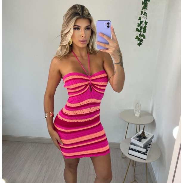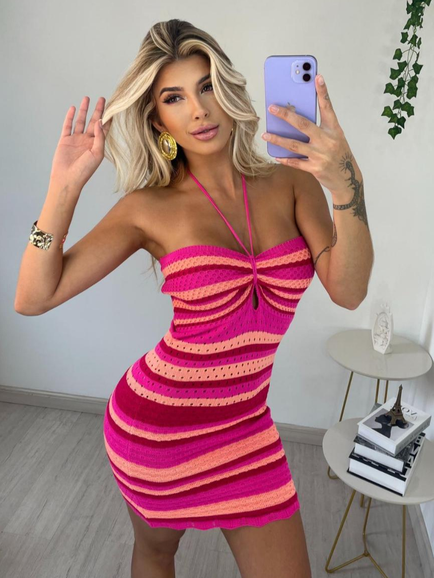 Vestido Curto Tricô Listrado Modal Cordão Amarração Tricot Verão