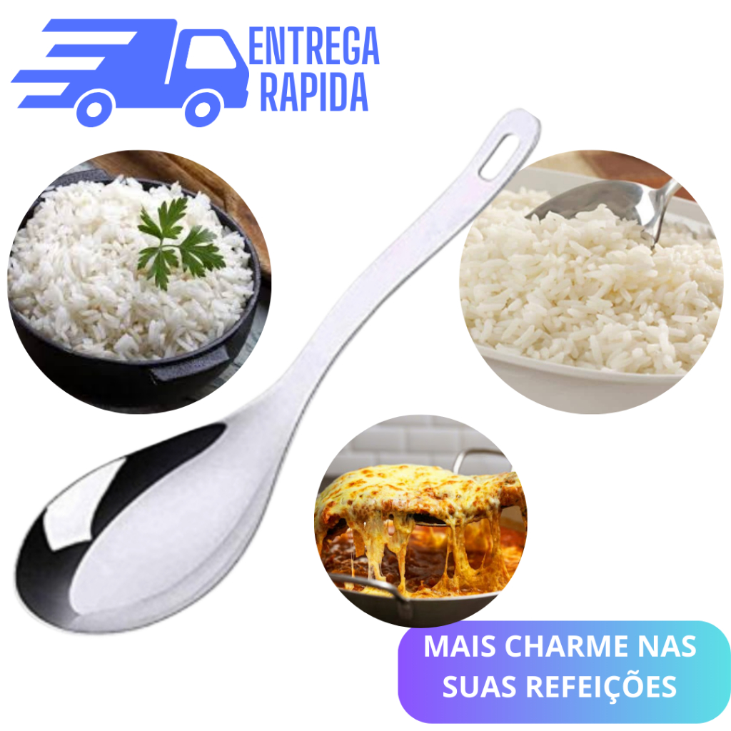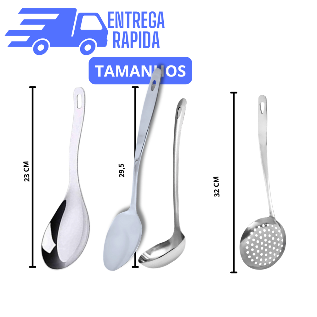 Kit 5 Utensílios de Cozinha 100% Aço Inox Concha Escumadeira Colher de Arroz Colher de Arroz longa e espatula para bolo
