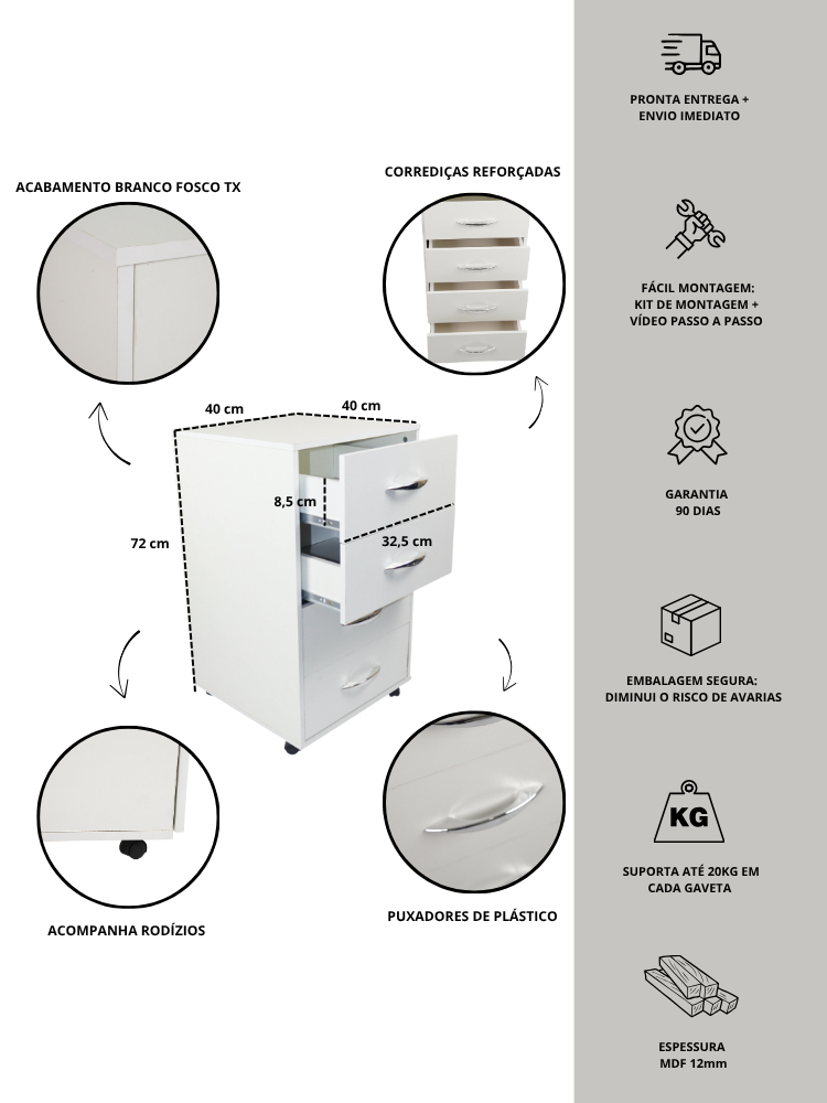 Armário Gaveteiro Cômoda Organizador Multiuso Quarto Escritório Sala Documentos Arquivos 4 Gavetas