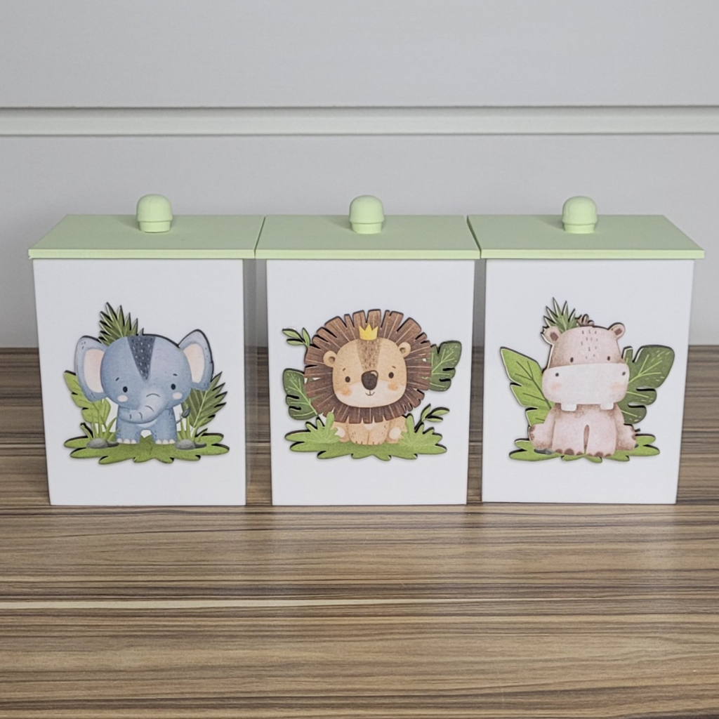 Jogo De Potes Organização Cotonete Algodão Bebê Bichinho Safari Menino Menina