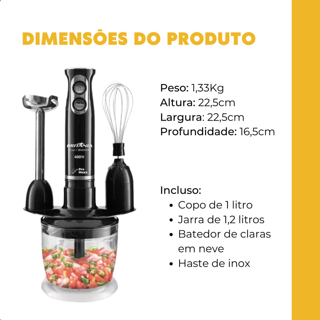 Mixer Britânia 3 em 1 BMX400P Preto 500W Com 2 Velocidades 110v ou 220v