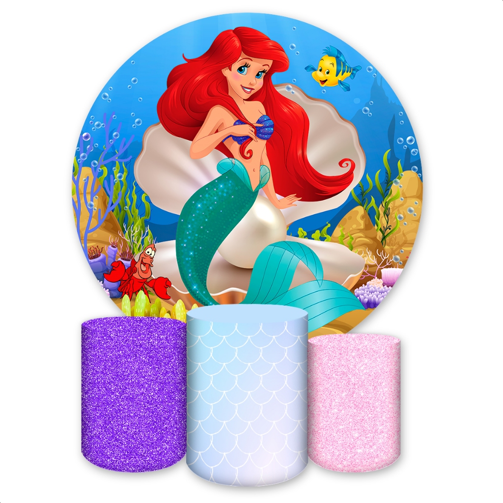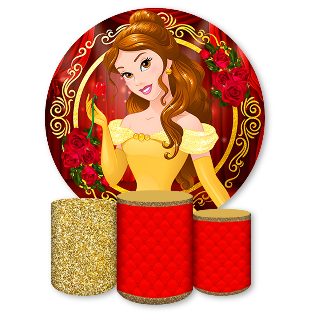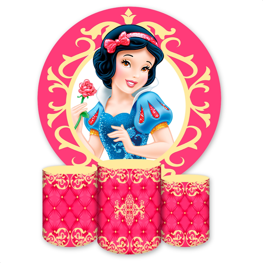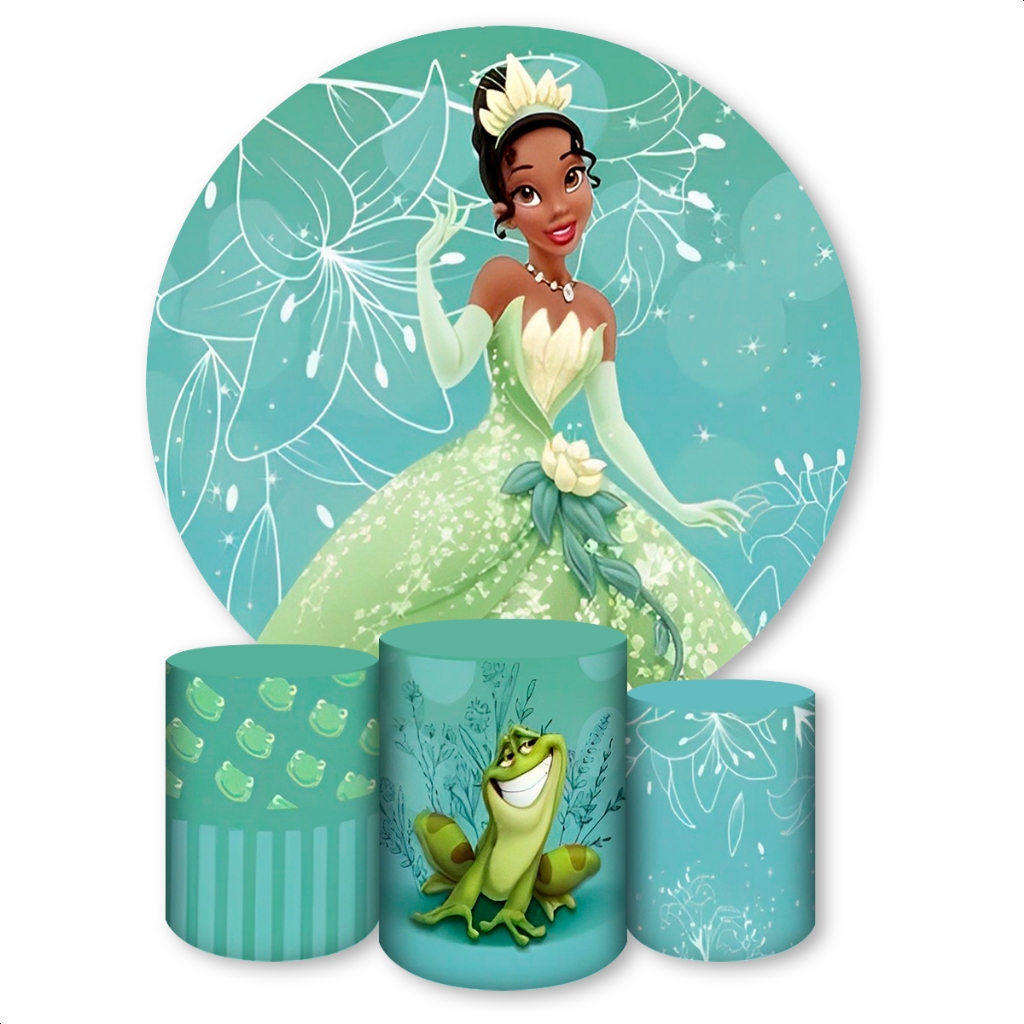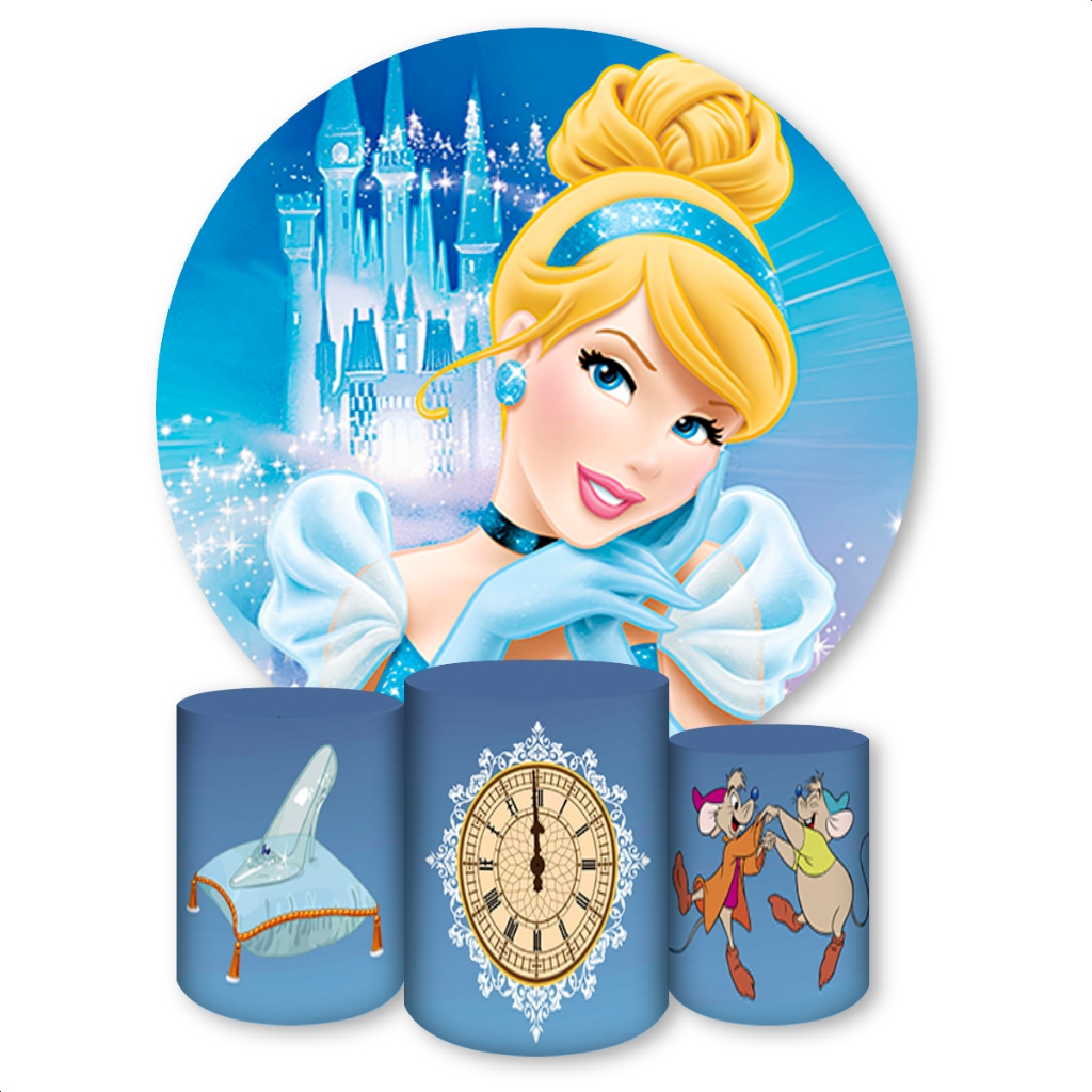 Kit Capa Painel Redondo + Capas de Cilindro Sublimados Para Festa Tema Princesas