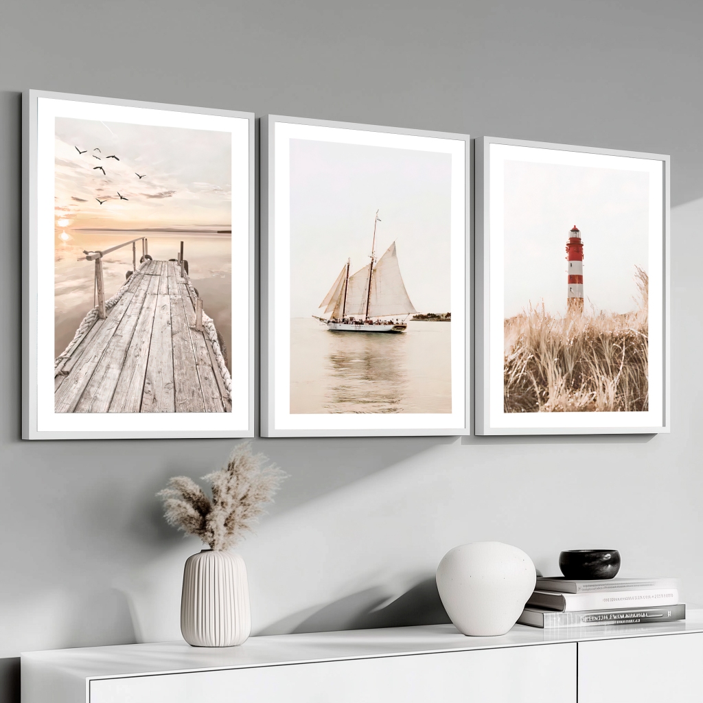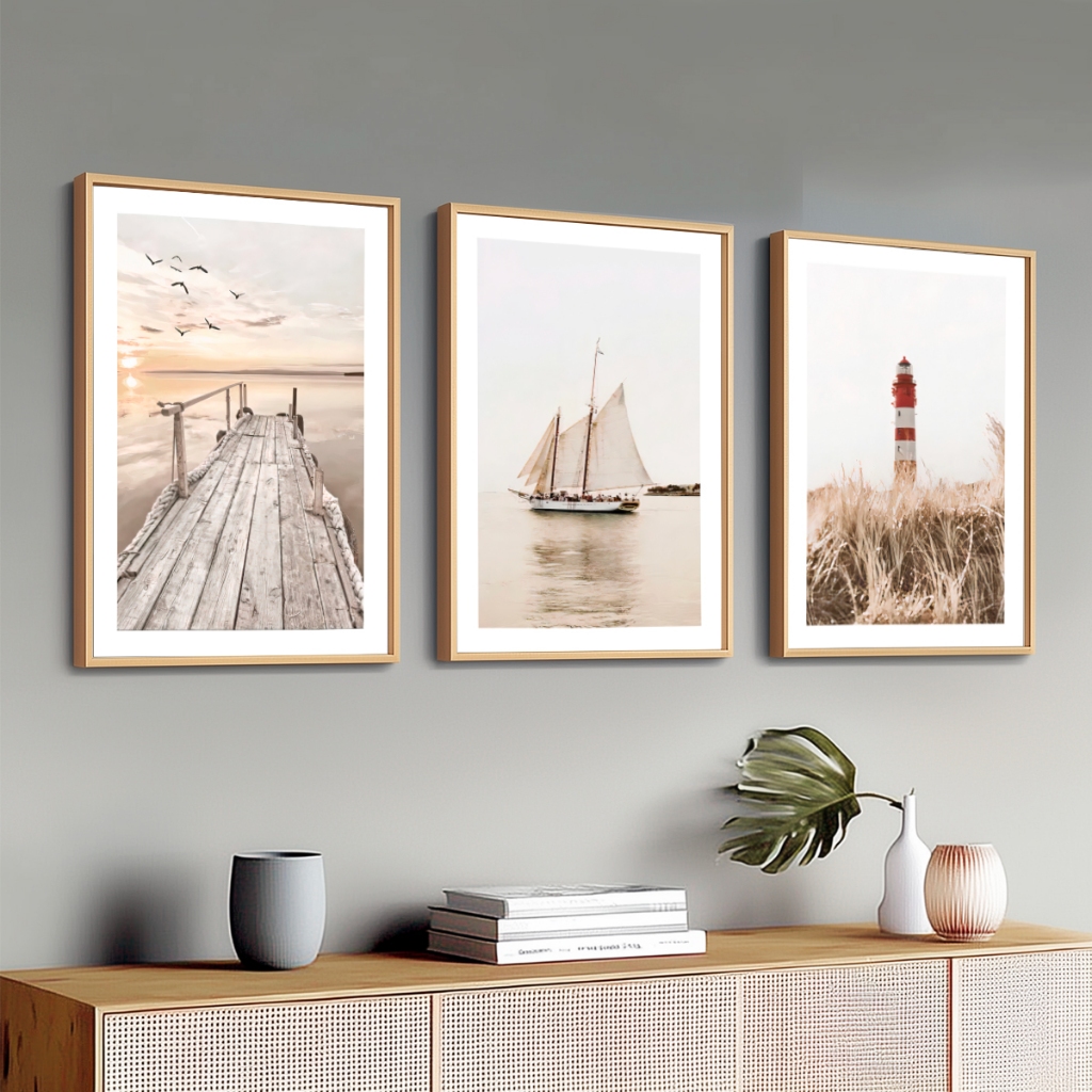 Kit 3 Quadros Modernos Barcos Porto Moldura 40X60 cm Sala Hall