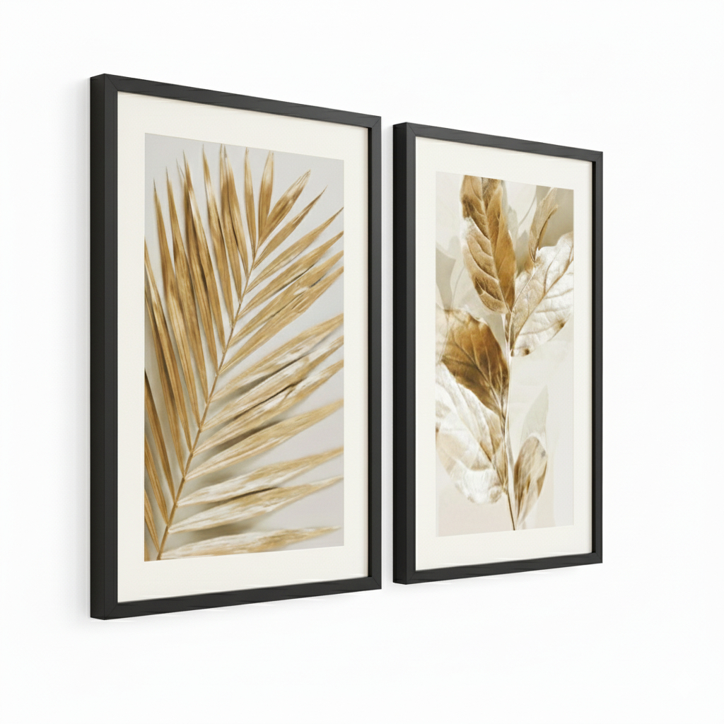 Kit 2 QuadrosDecorativos Moldura 40x60 Folhagem Dourada Grande Luxo Quarto Sala