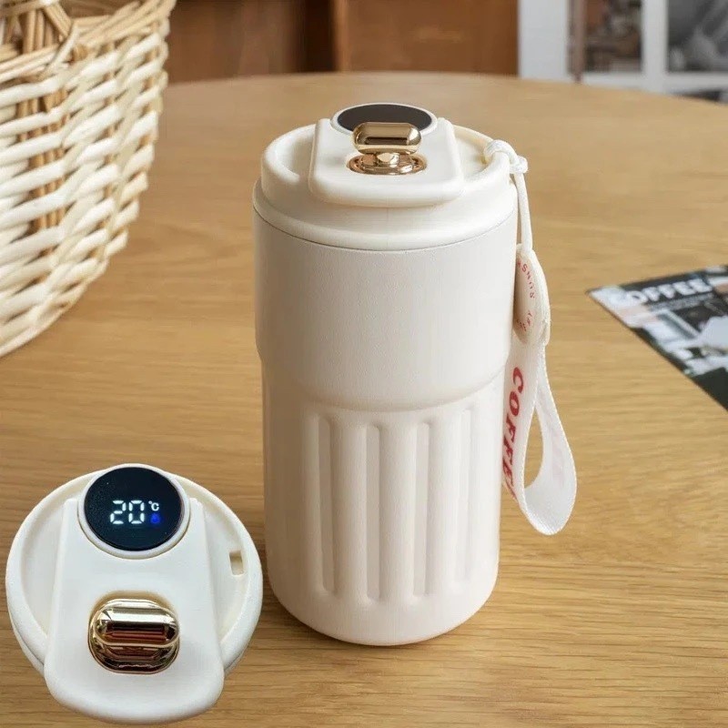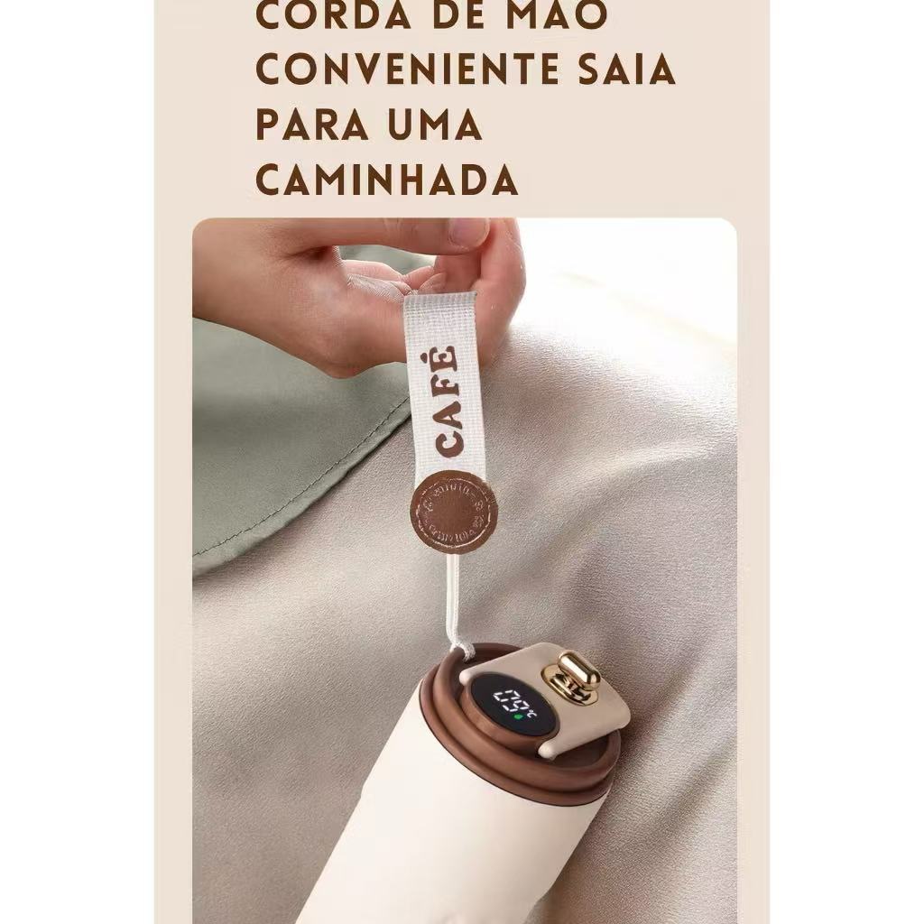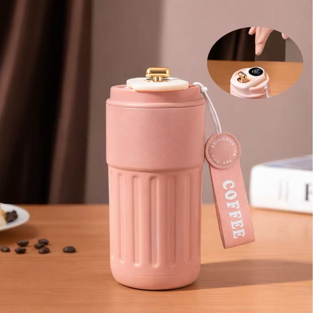 Copo Térmico Cafe Inox Portátil com tampa ,450ml Com LED Temperatura Antivazamento—