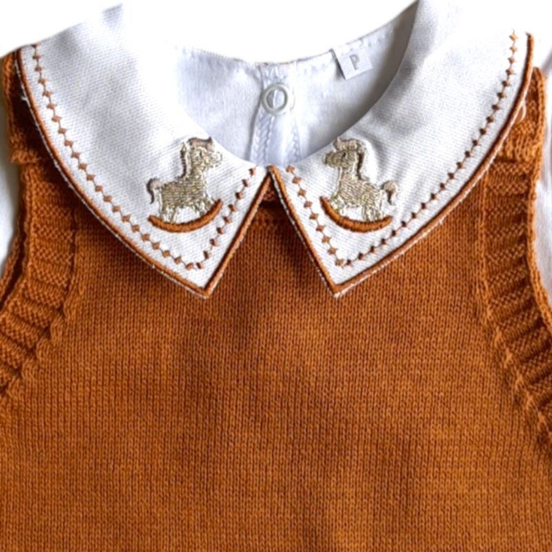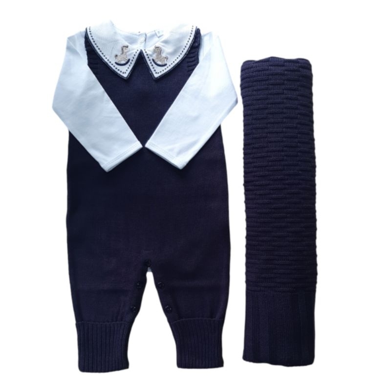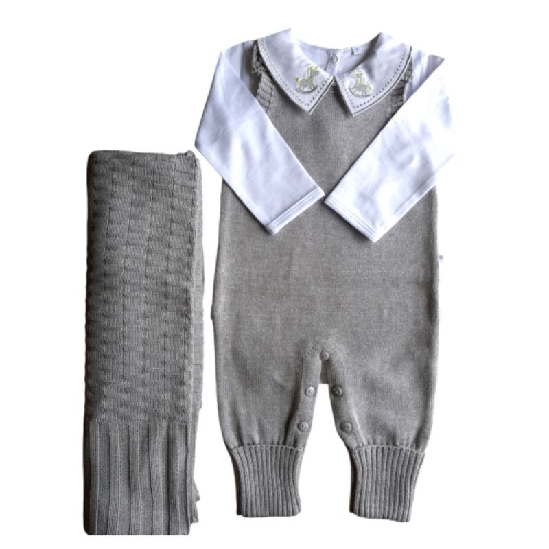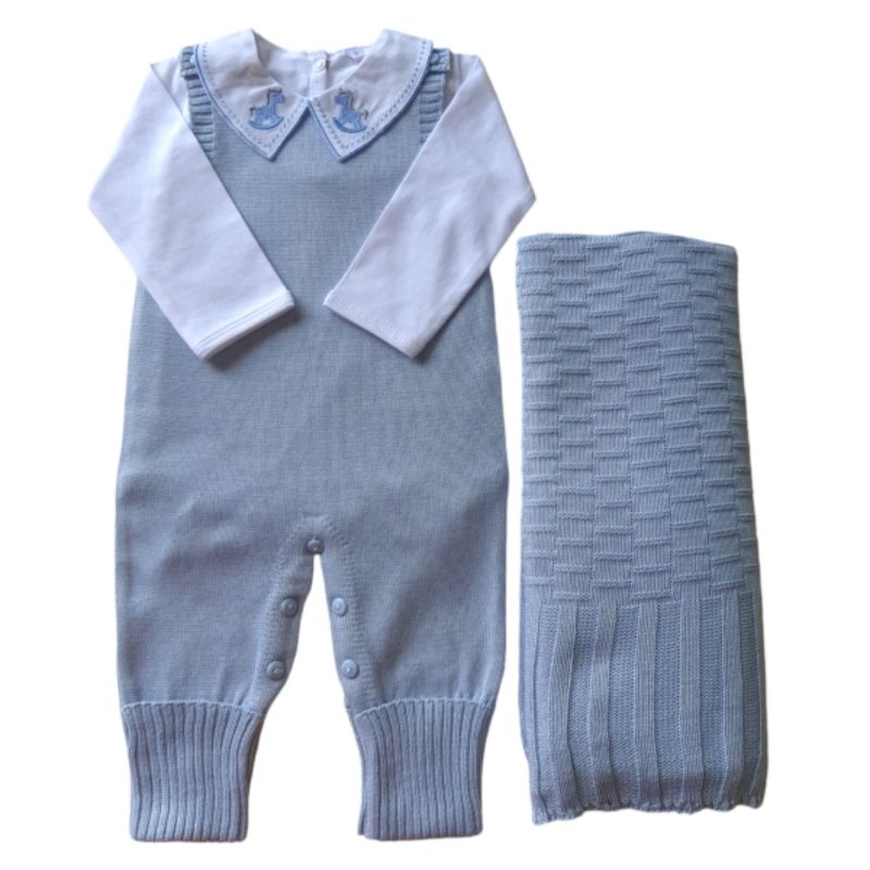 conjunto trico saida maternidade 3 peças, jardineira, manta e body gola cavalinho.