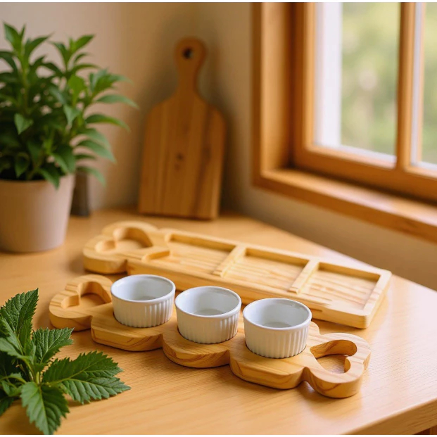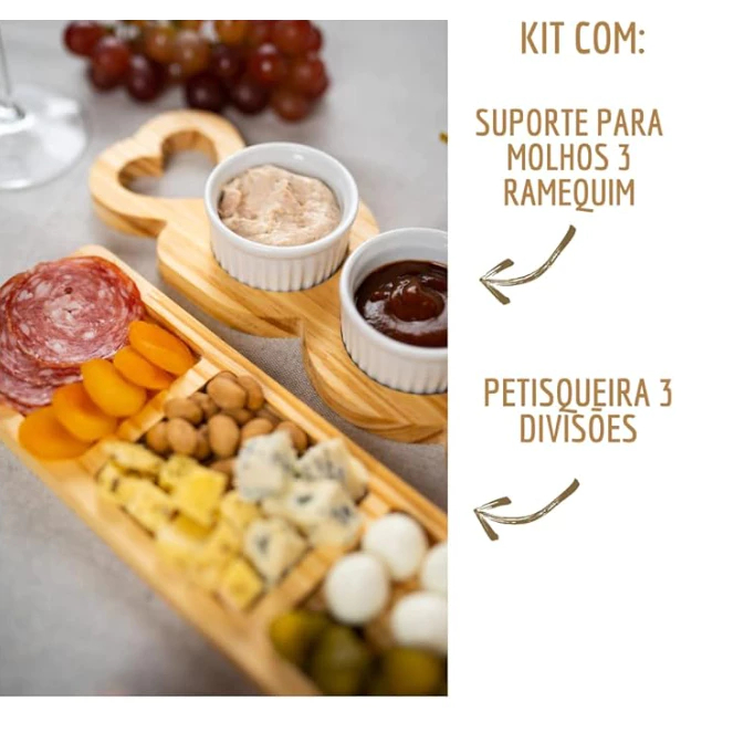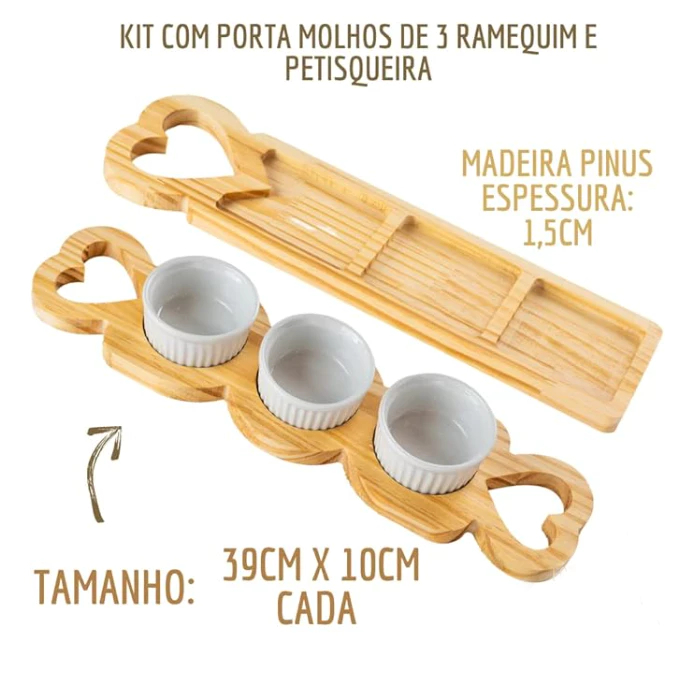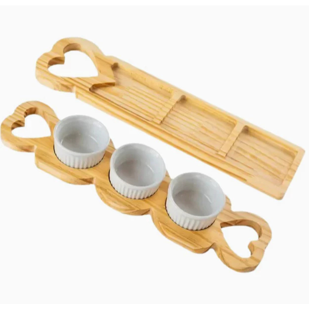 Kit 2pcs Petisqueira de Madeira Kit Petisqueira para Molhos com Trio de Ramequin de Porcelana Branc