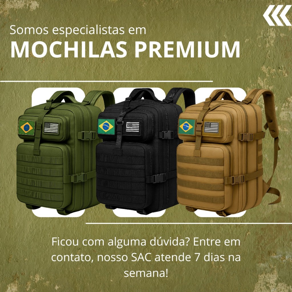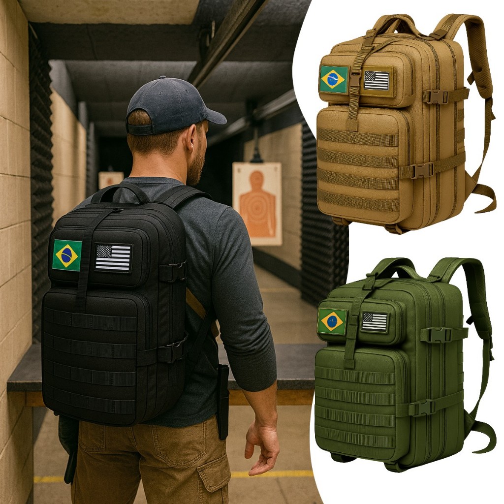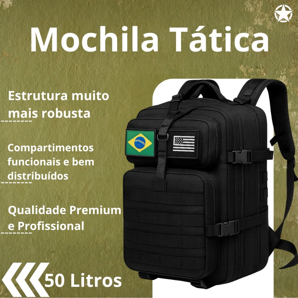 Mochila Militar Tática Impermeável 50 Litros Grande Reforçada com 2 Bandeiras Brasil EUA