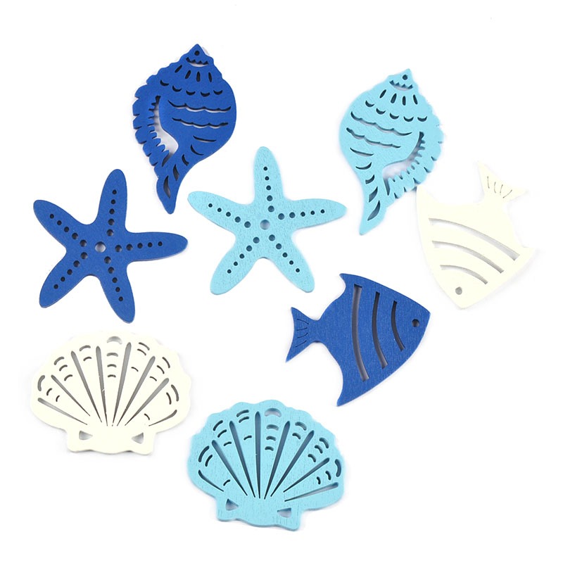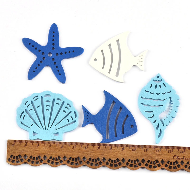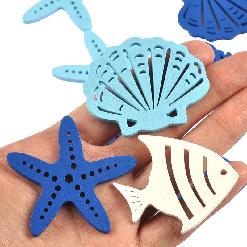 10Pcs 5-6cm Misturado Ocean Shell/Fish/Starfish Artesanato Em Madeira Pendurado Ornamentos Pingente De Azul/Branco Home Decor DIY Arts CP4007