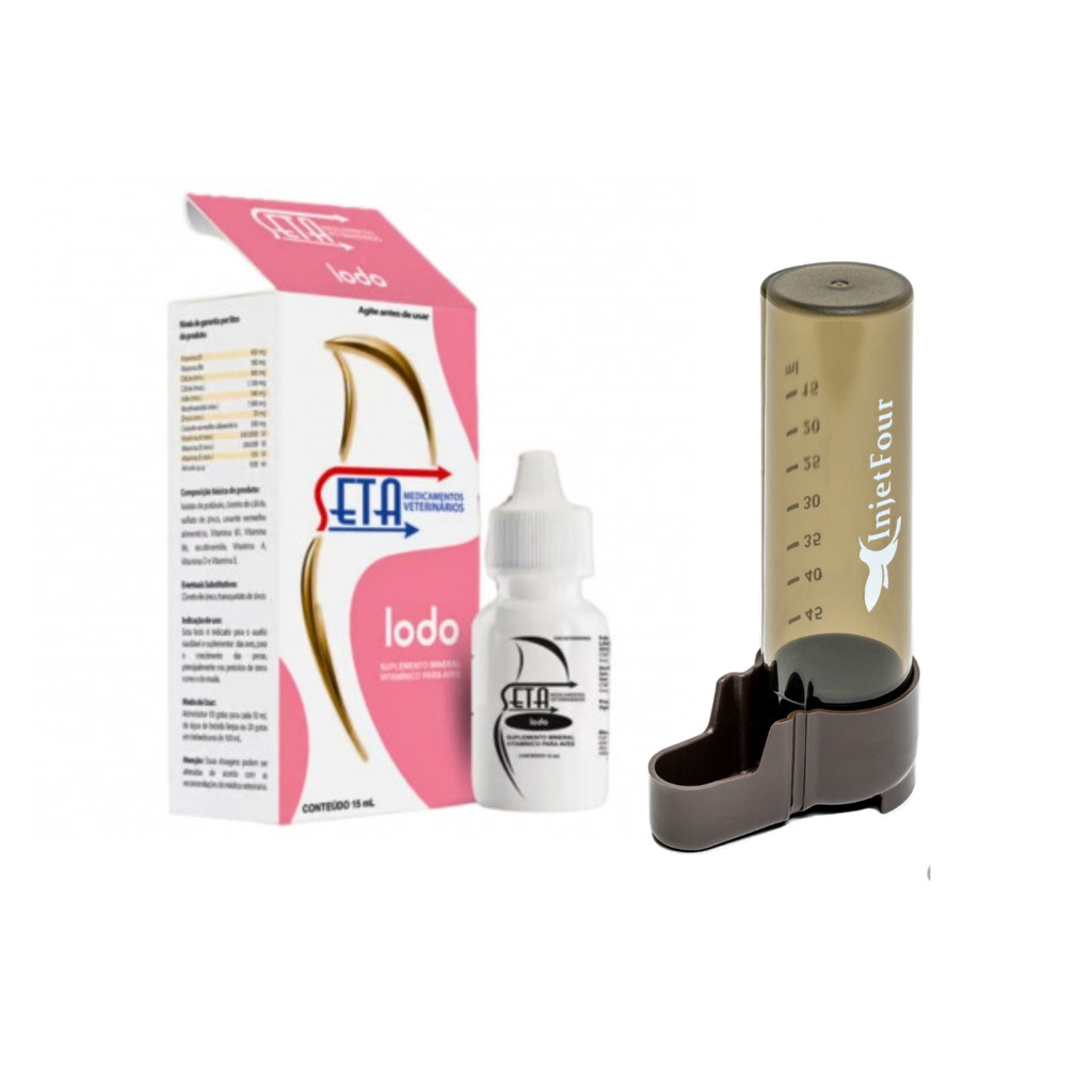 Kit Seta Iodo 15ml | Suplemento + Bebedouro Para Pássaros / Dosagem / Âmbar 50ml
