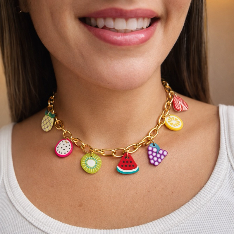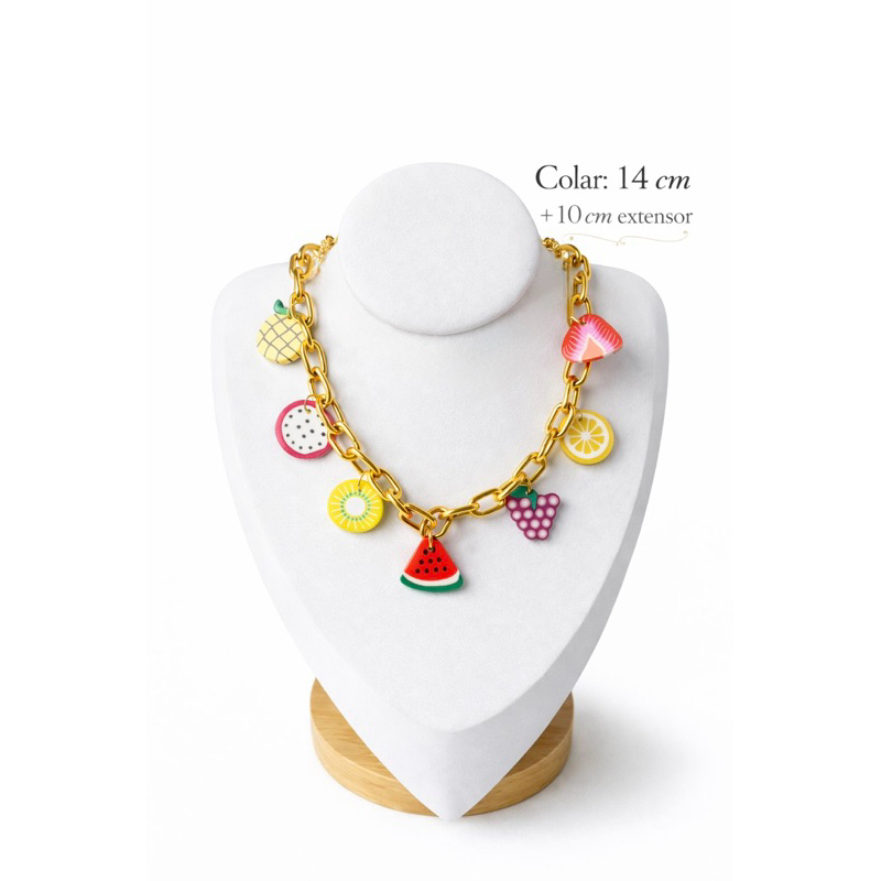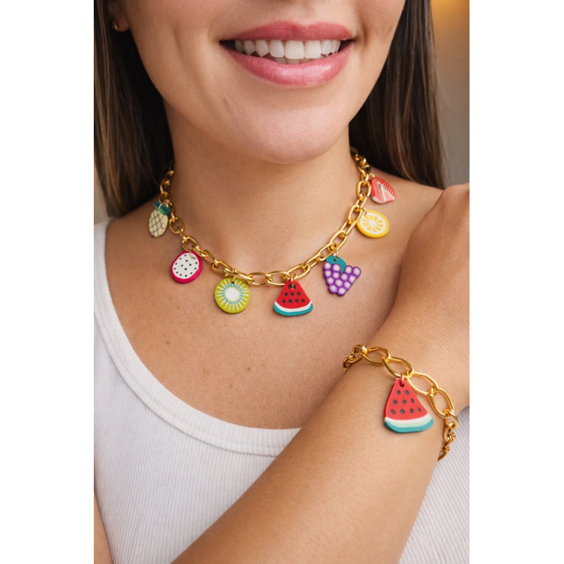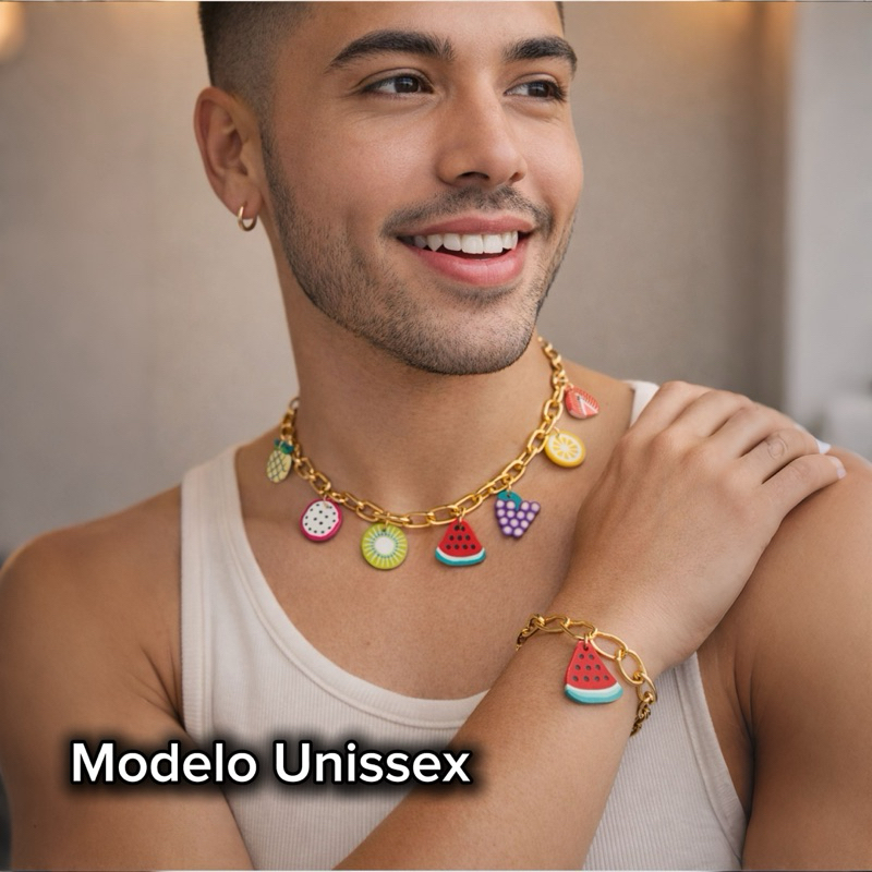 Kit Colar e Pulseira Frutinhas em Silicone – Corrente Folheada