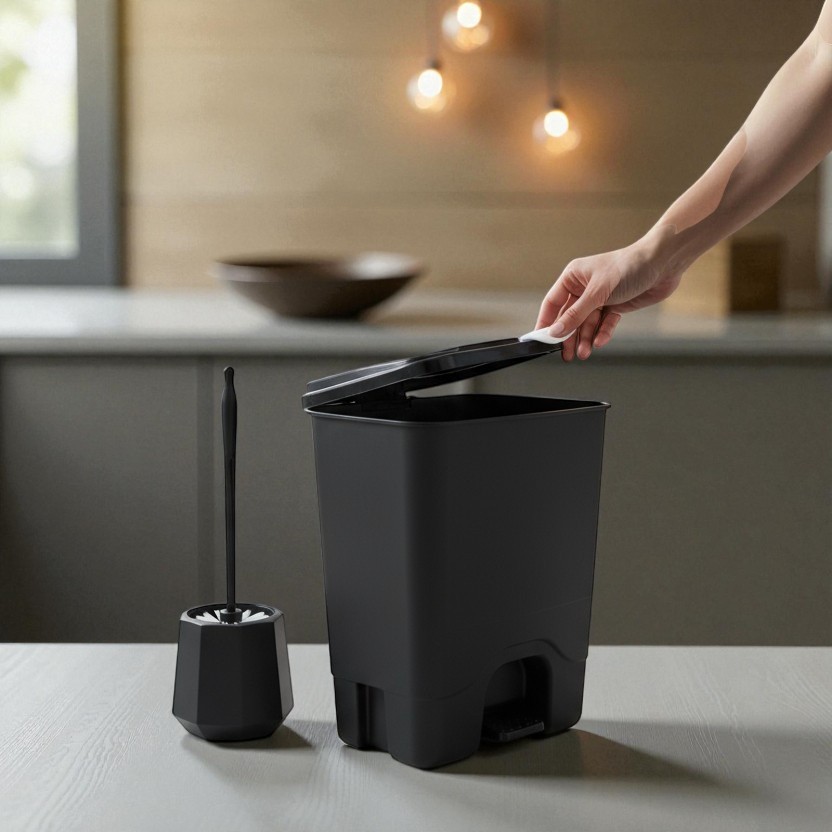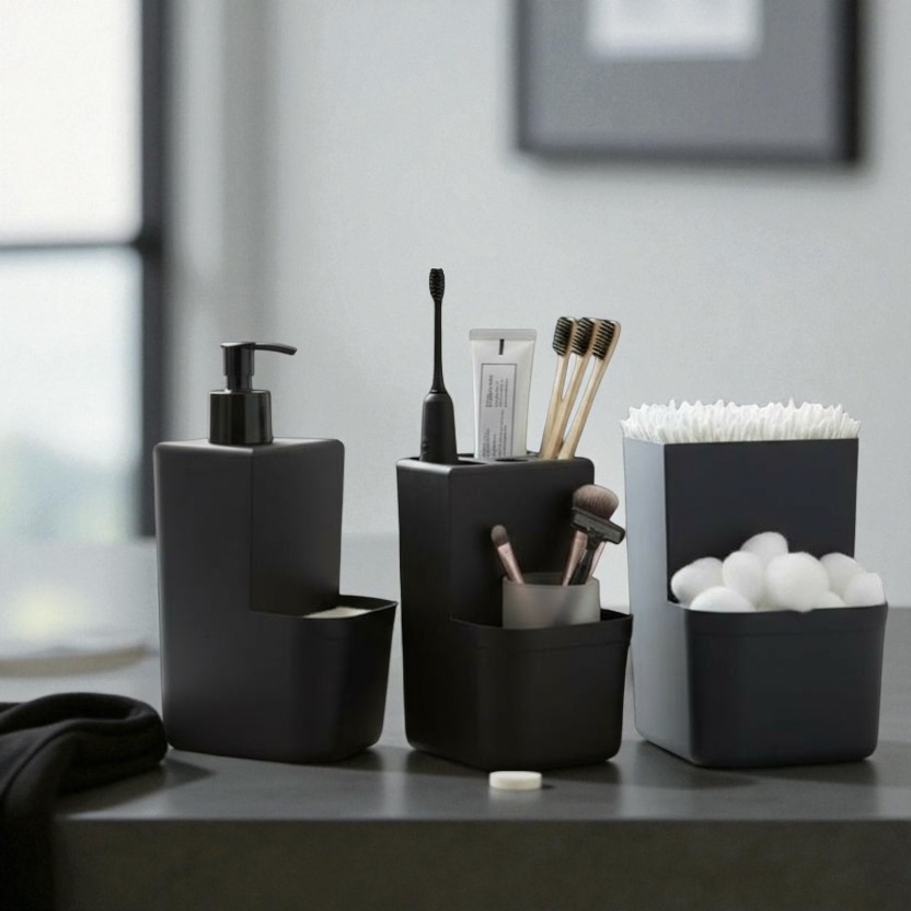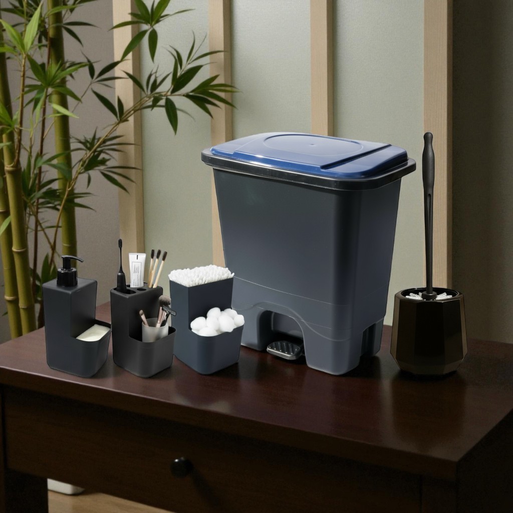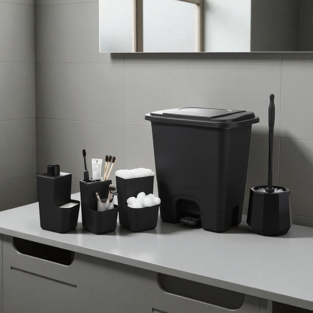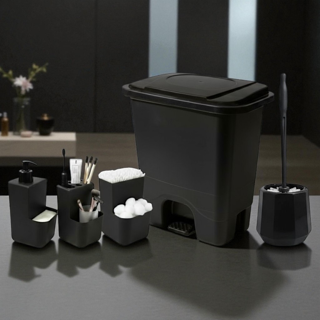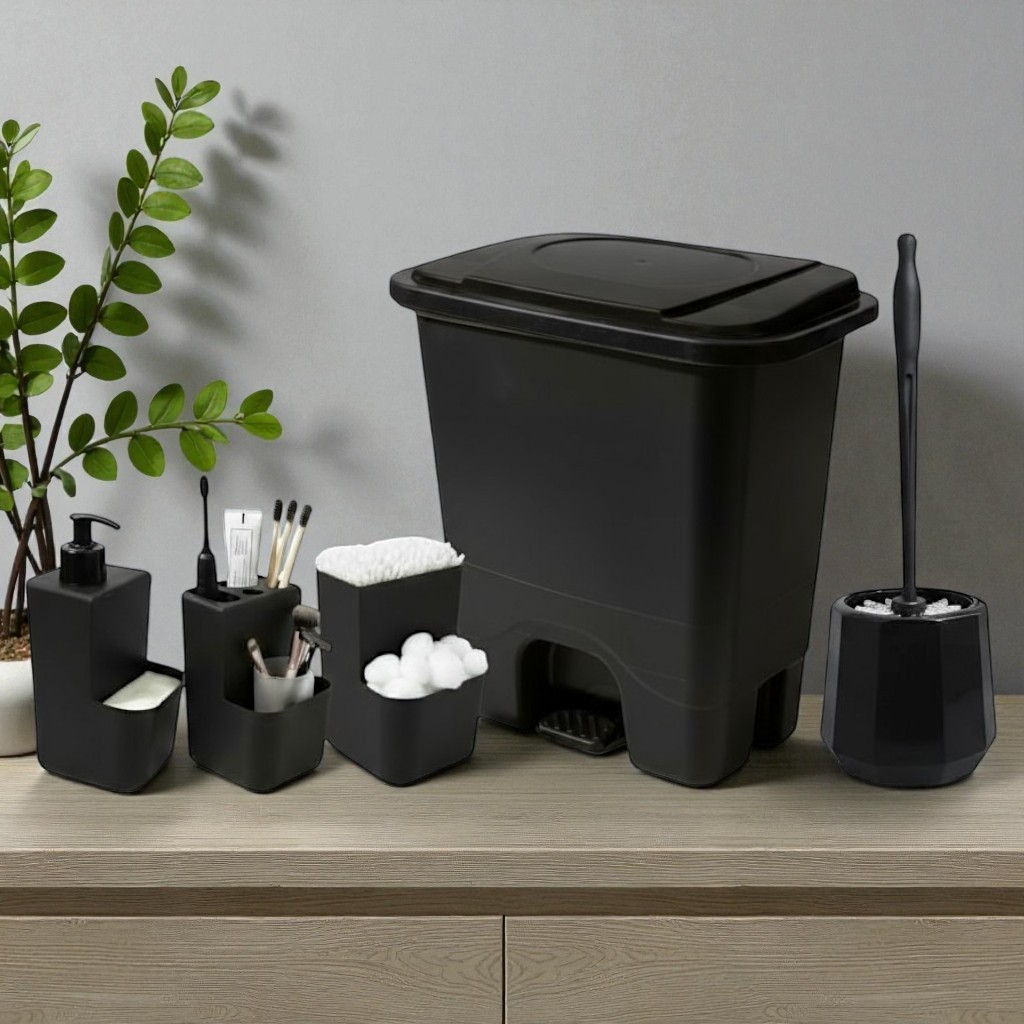 Conjunto Completo Acessórios Banheiro 5 Peças – Organizador, Lixeira Pedal, Dispenser Sabonete, Porta Escova, Cotonete
