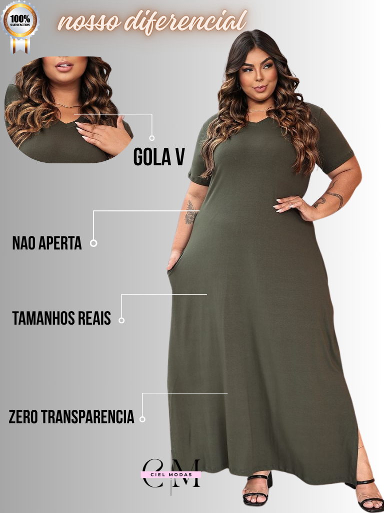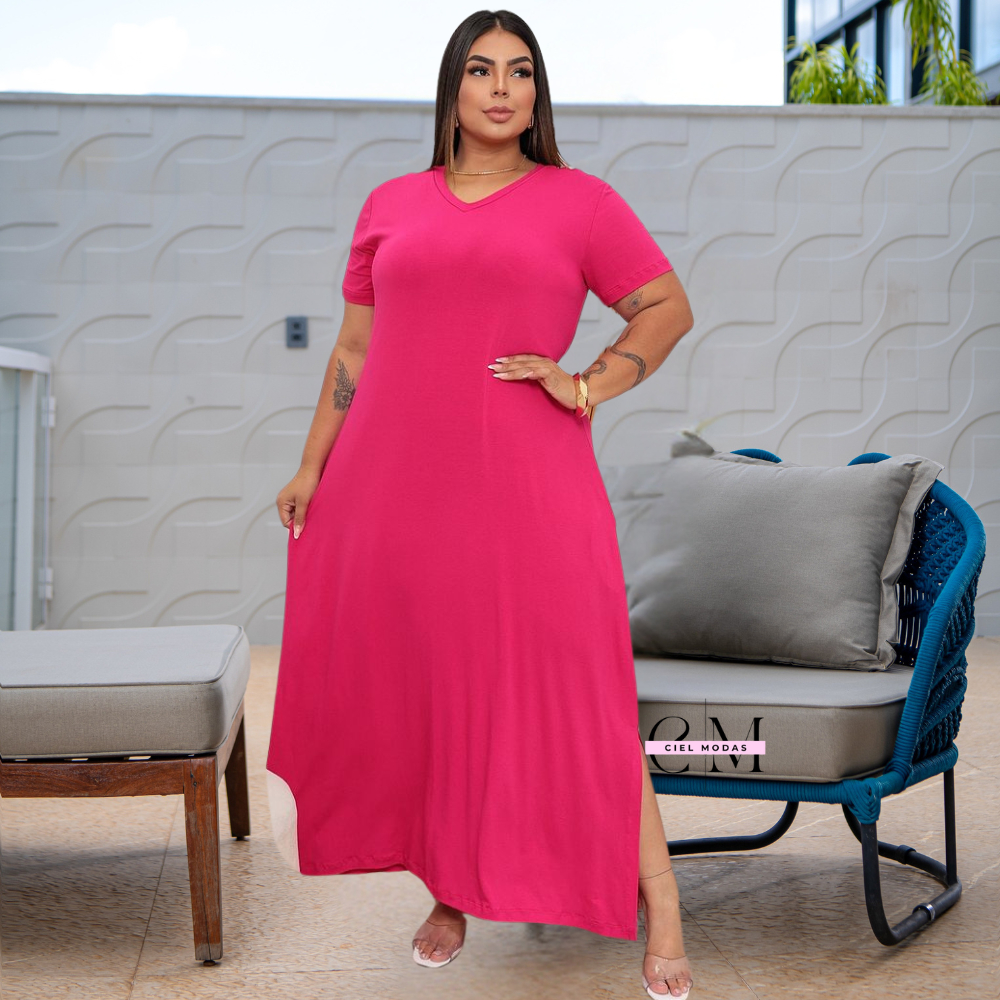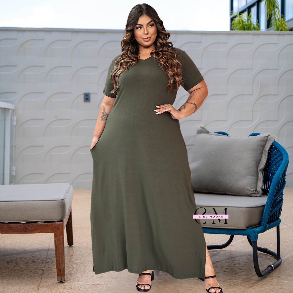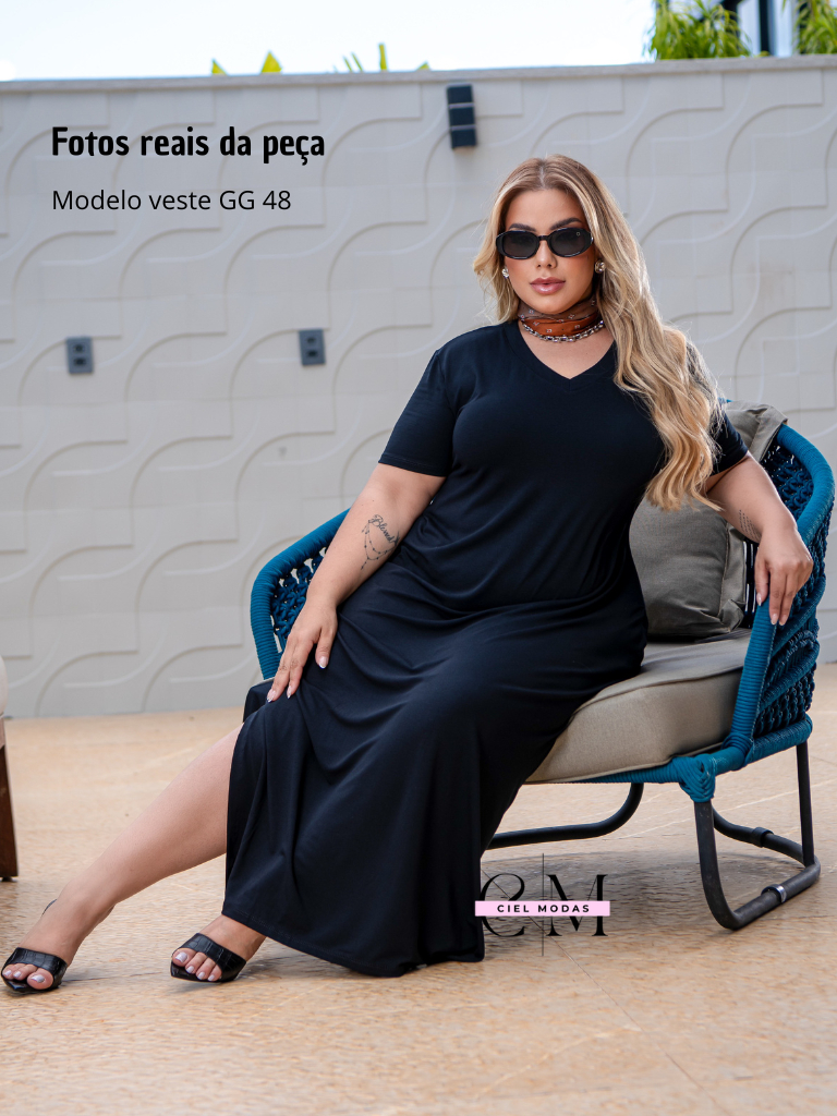 Vestido plu size feminino longo gola V 44 - 54 viscolycra premium confortável vestidos plus soltinho