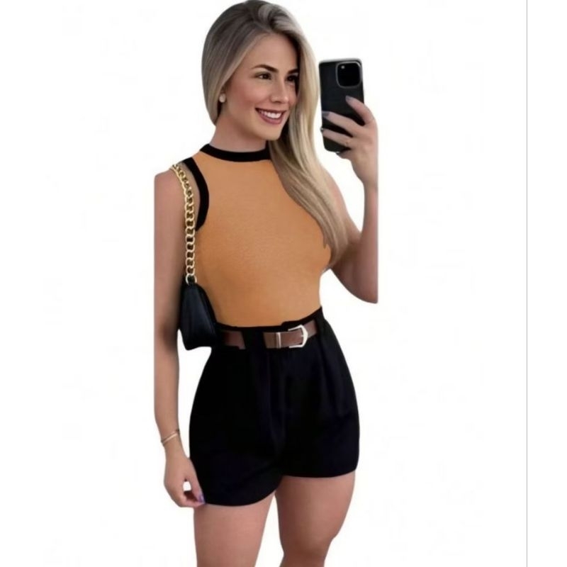 Conjunto feminino em alta short + cropped + cinto ajustável