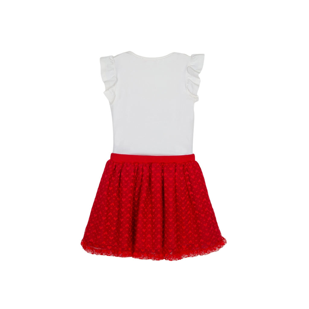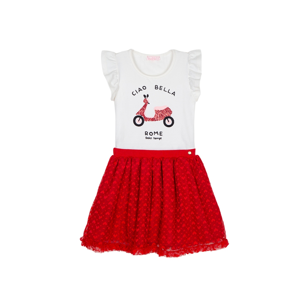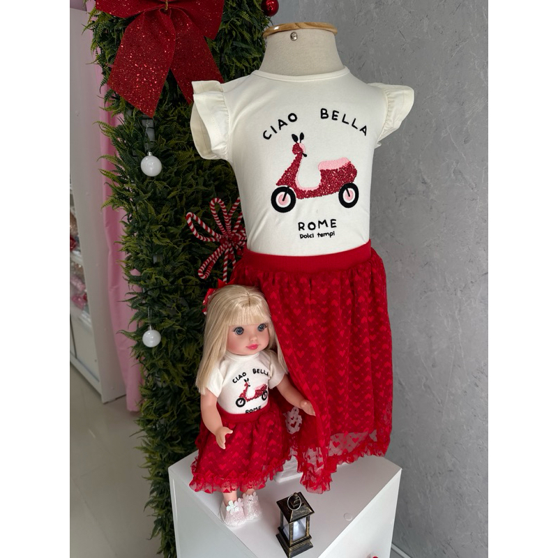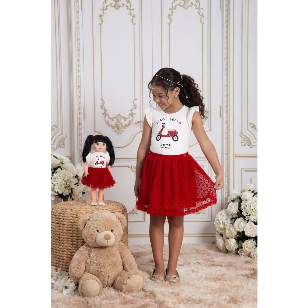 Conjunto Verão Infantil Menina Blusa e Saia com Shorts Vermelho Marthiê -Acompanha Roupinha da Boneca Igual