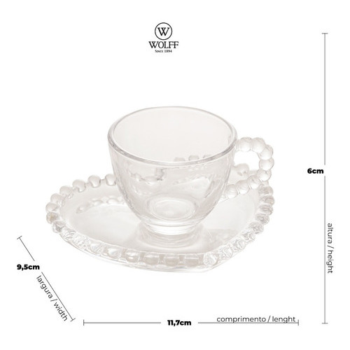 Jogo 4 Xícaras 85ml Café de Cristal Com Pires Coração Pearl Wolff