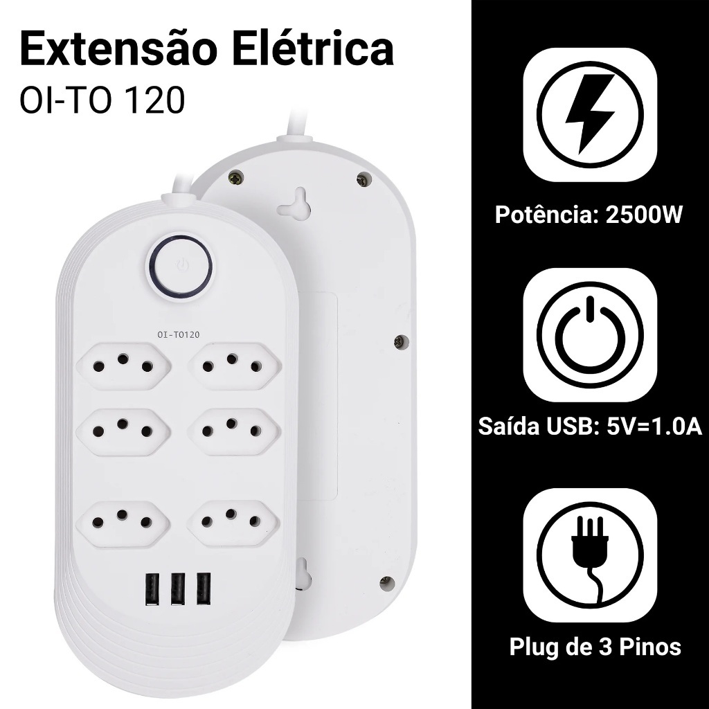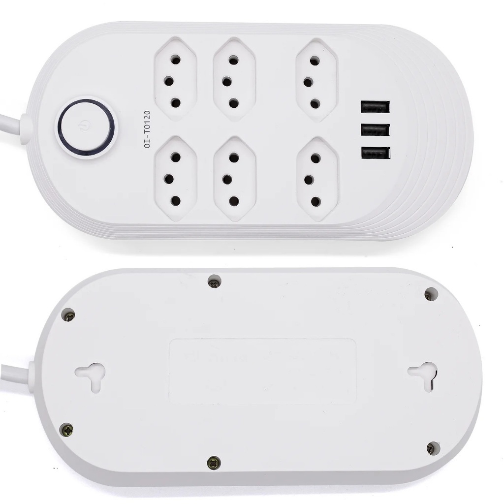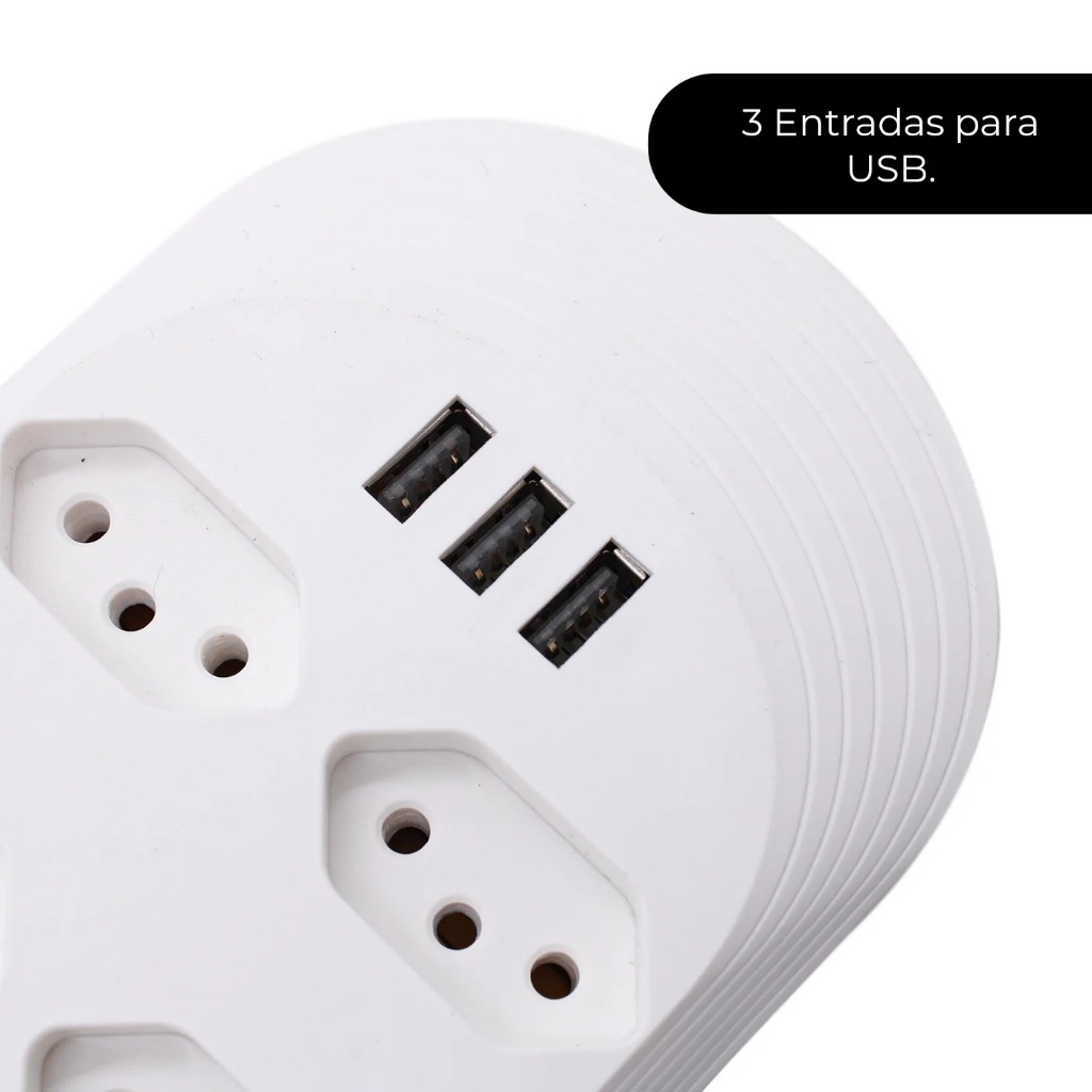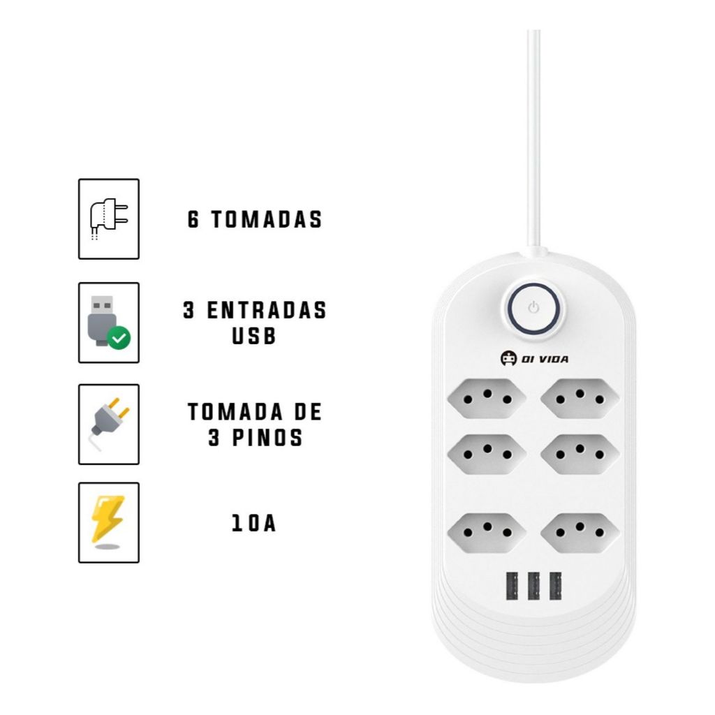 Extensão Elétrica 1,8m Com 6 Tomadas e 3 Entradas USB 10A Botão Liga e Desliga - Filtro Linha Régua 110V 220V Bivol