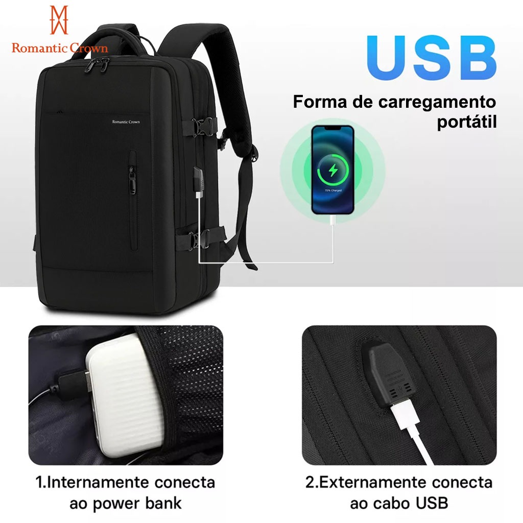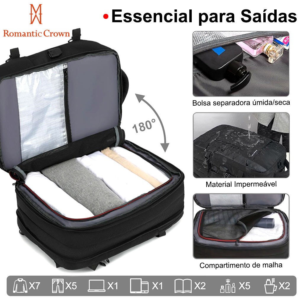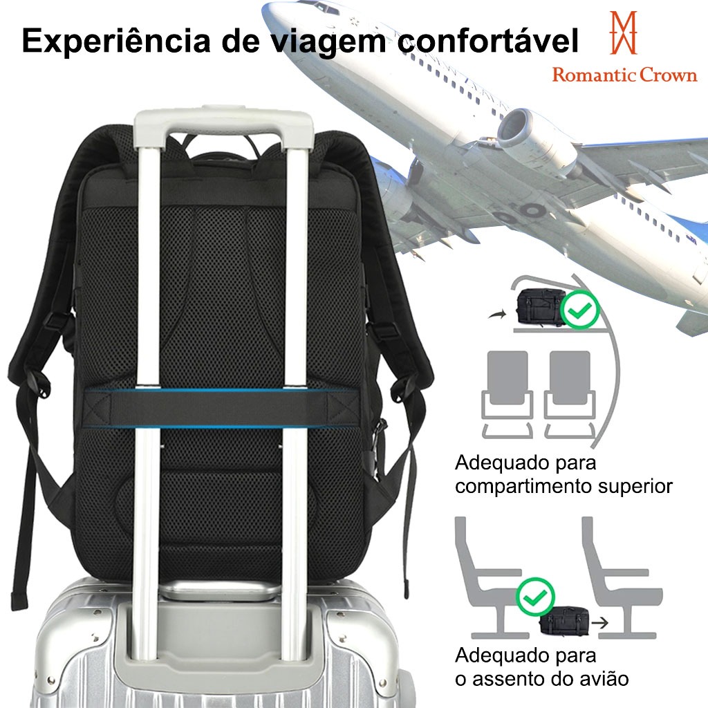 ROMANTIC CROWN Mochila de Viagem Executiva Expansível 45L Reforçada para Notebook Masculina e Feminina