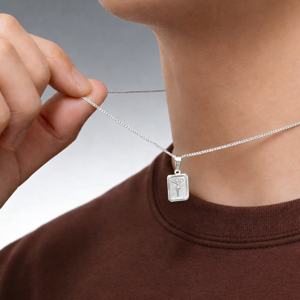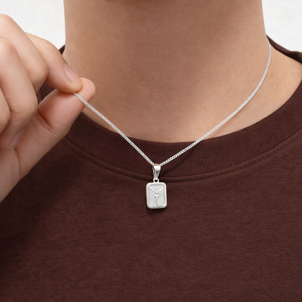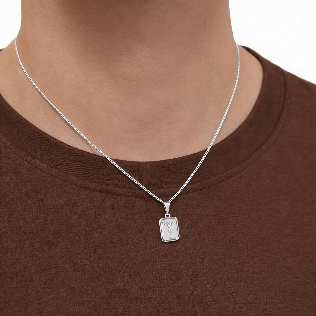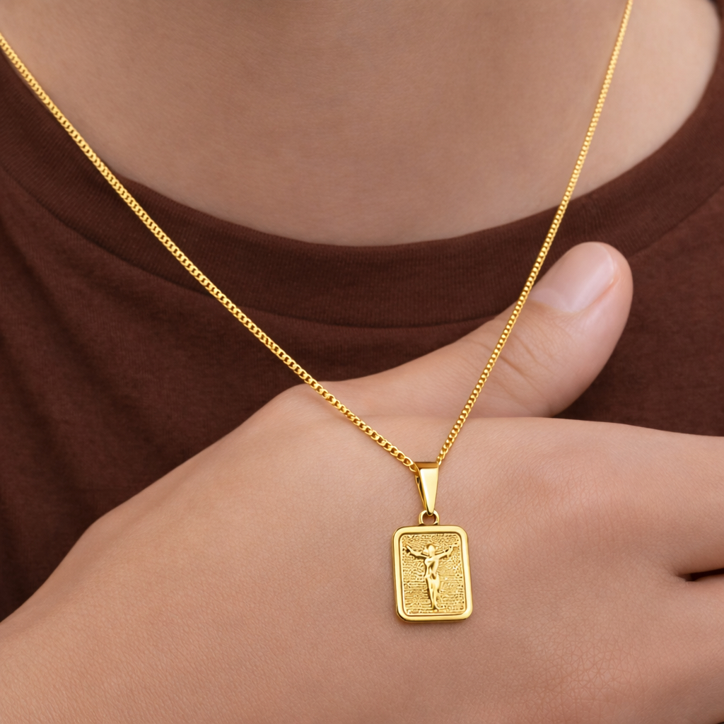 Correntinha Prata 925 Masculina Curta + Pingente Cristo Retangular Banhado A Prata 925 Ouro 18k