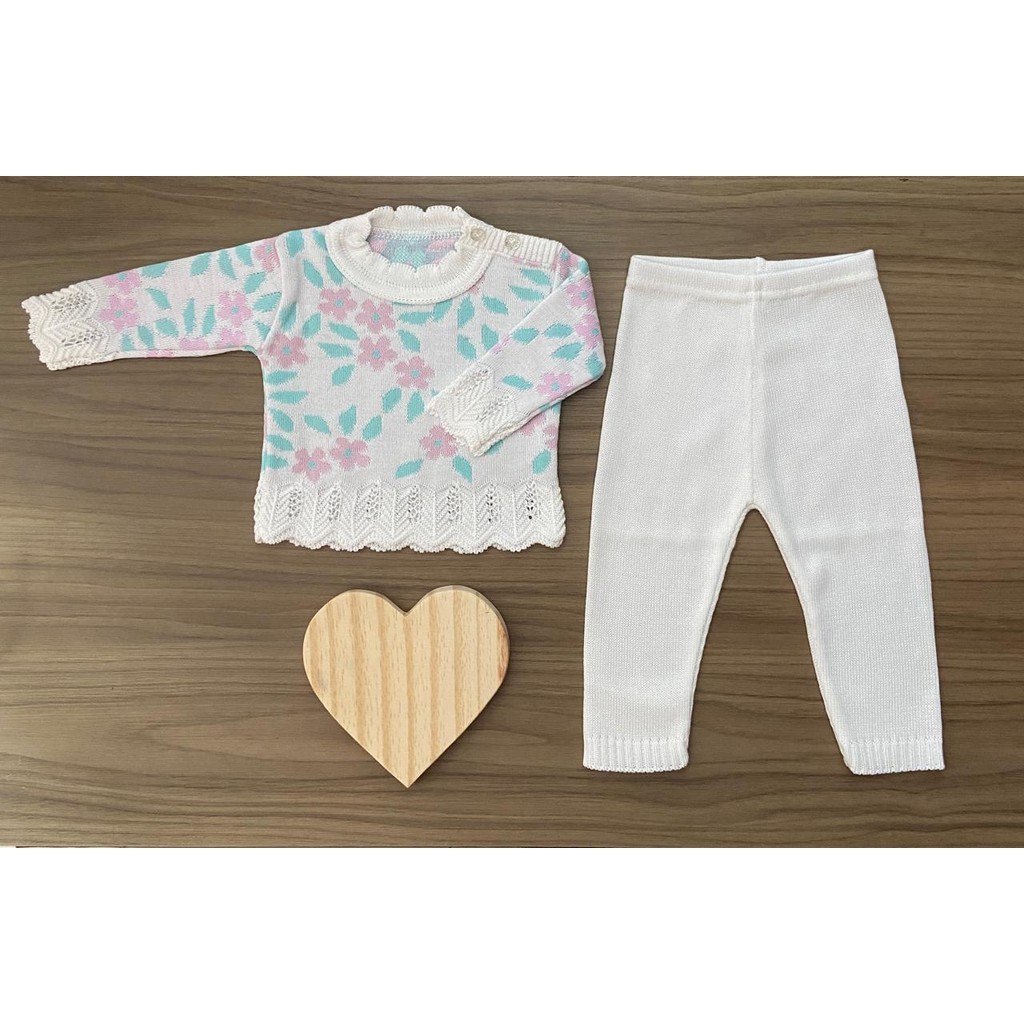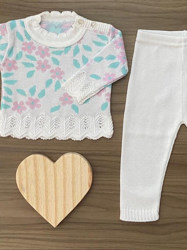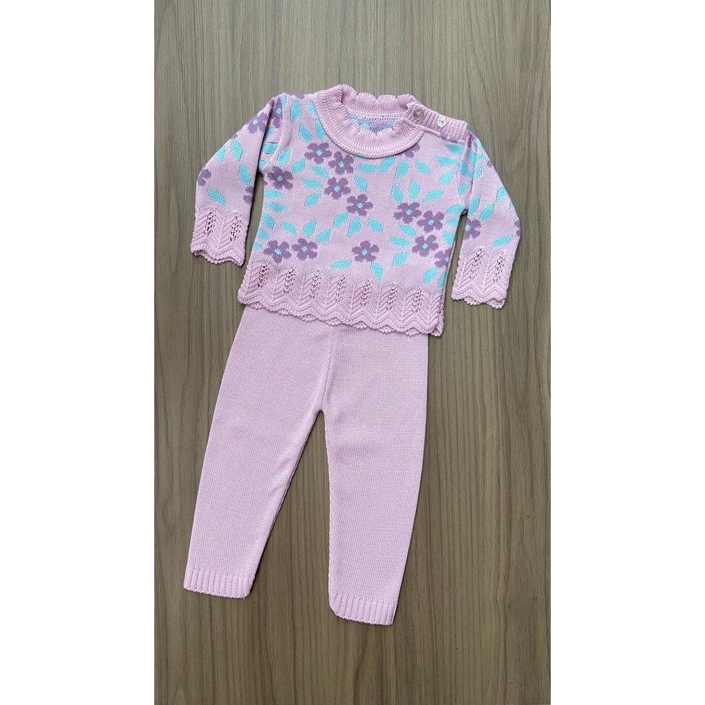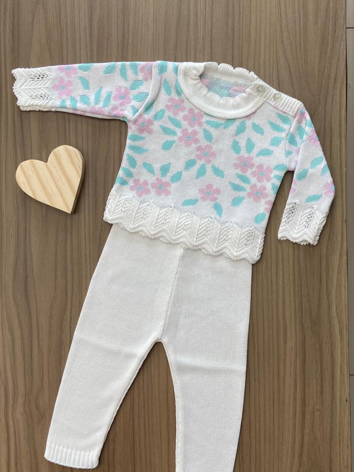 Conjunto Blusa Flor Calça Menina Recem Nascido Tricô Rn Bebê Infantil