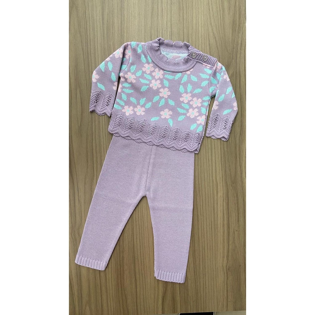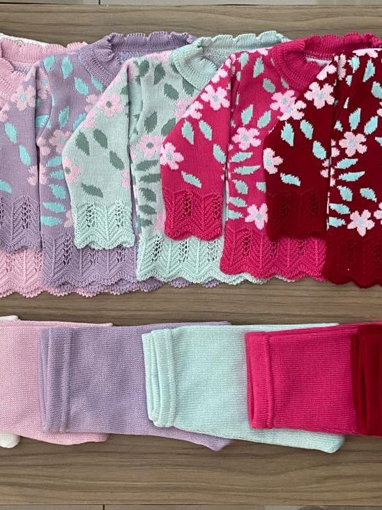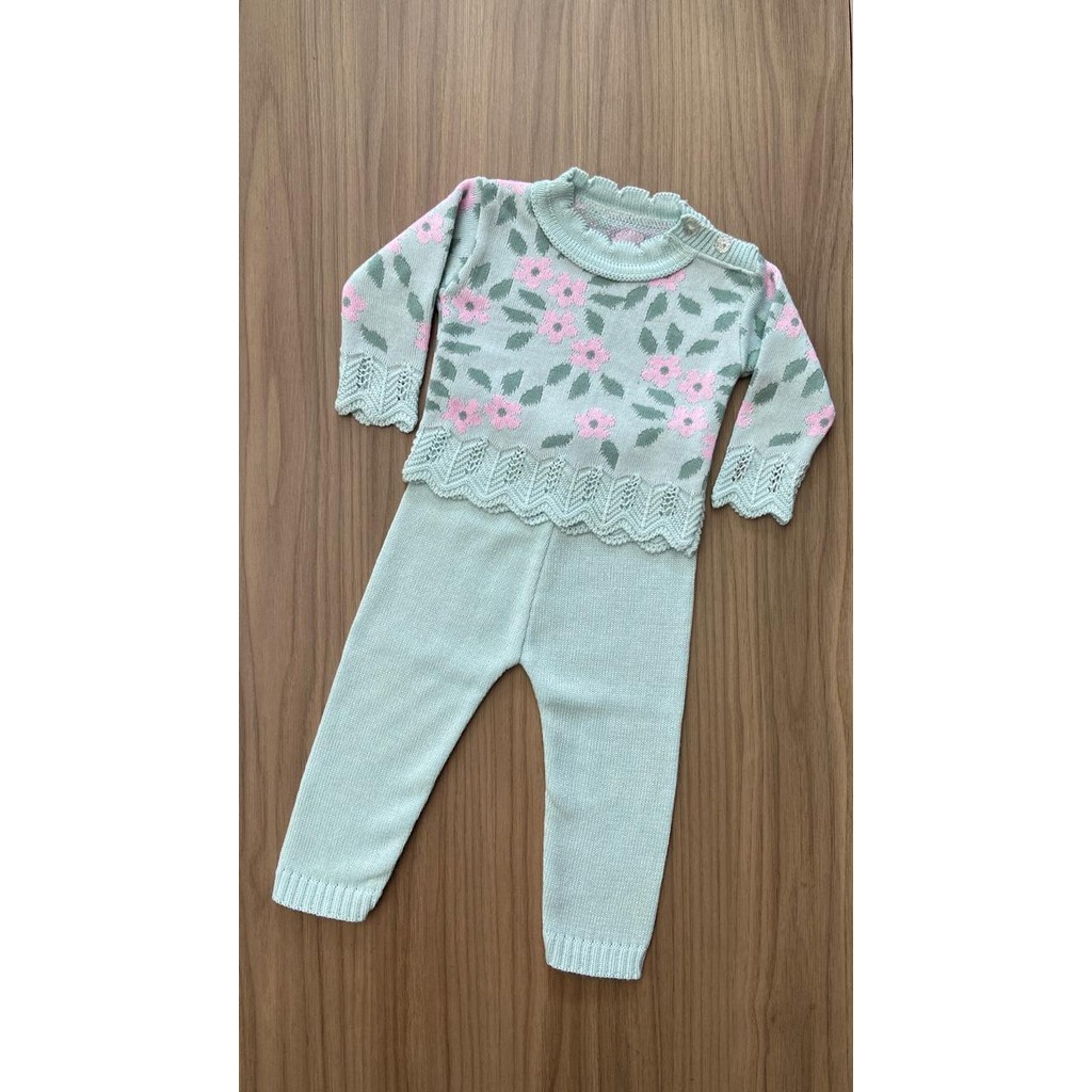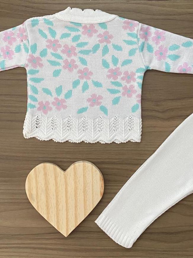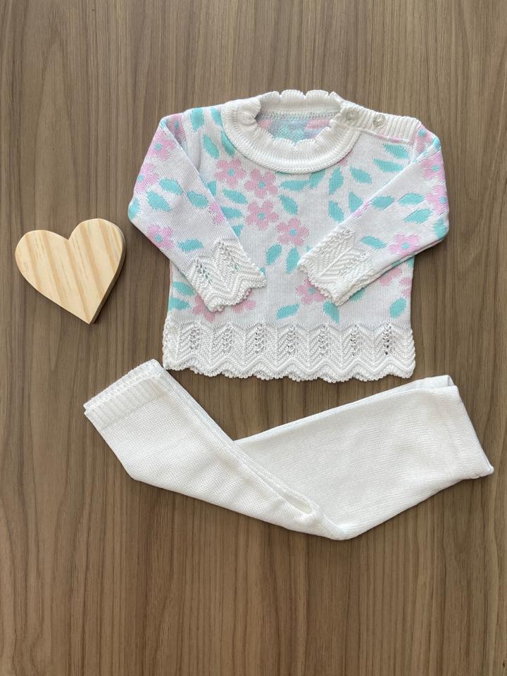 Conjunto Blusa Flor Calça Menina Recem Nascido Tricô Rn Bebê Infantil