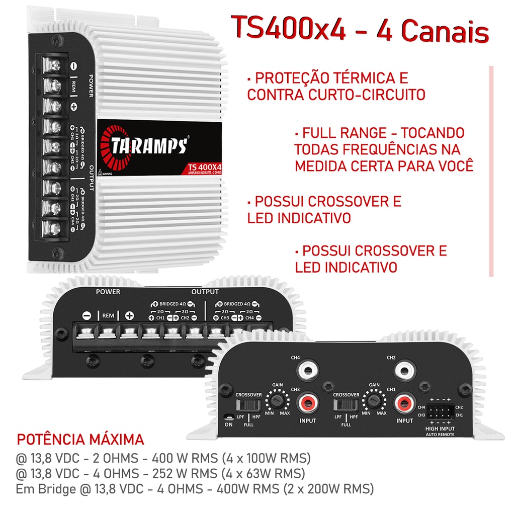 Módulo Amplificador Taramps TS 400 X 4 Canais COM ENTRADA FIO 400 Watts RMS 2 Ohms