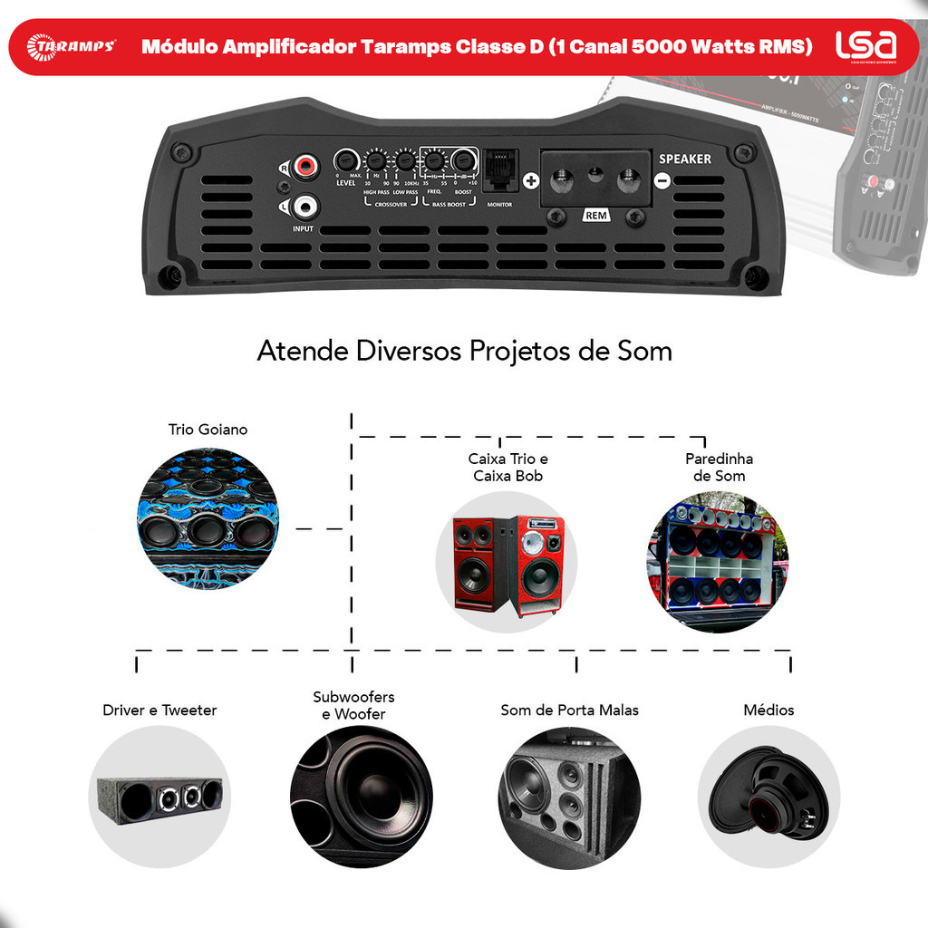 Modulo MD 5000.1 5000WRMS 1 Ohm Som Automotivo Taramps Full Range Subwoofer Potência Crossover