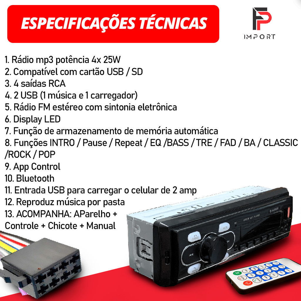 Rádio Som Automotivo FP Imports Bluetooth USB AUX SD Leitor MP3 P/ Carro