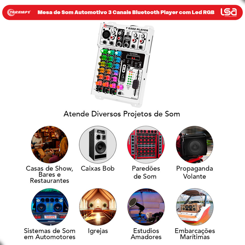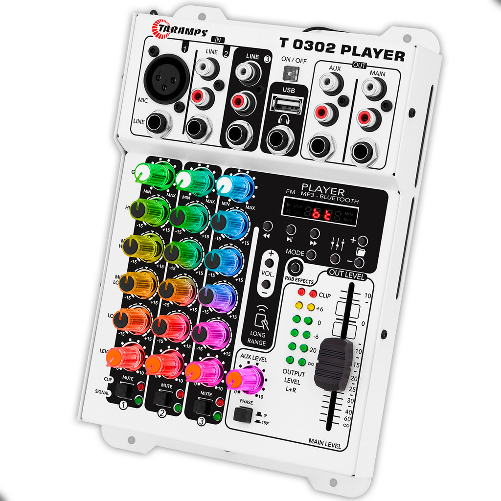 Mesa de Som Taramps 3 Canais T0302 Player Bluetooth USB Mixer e Relógio