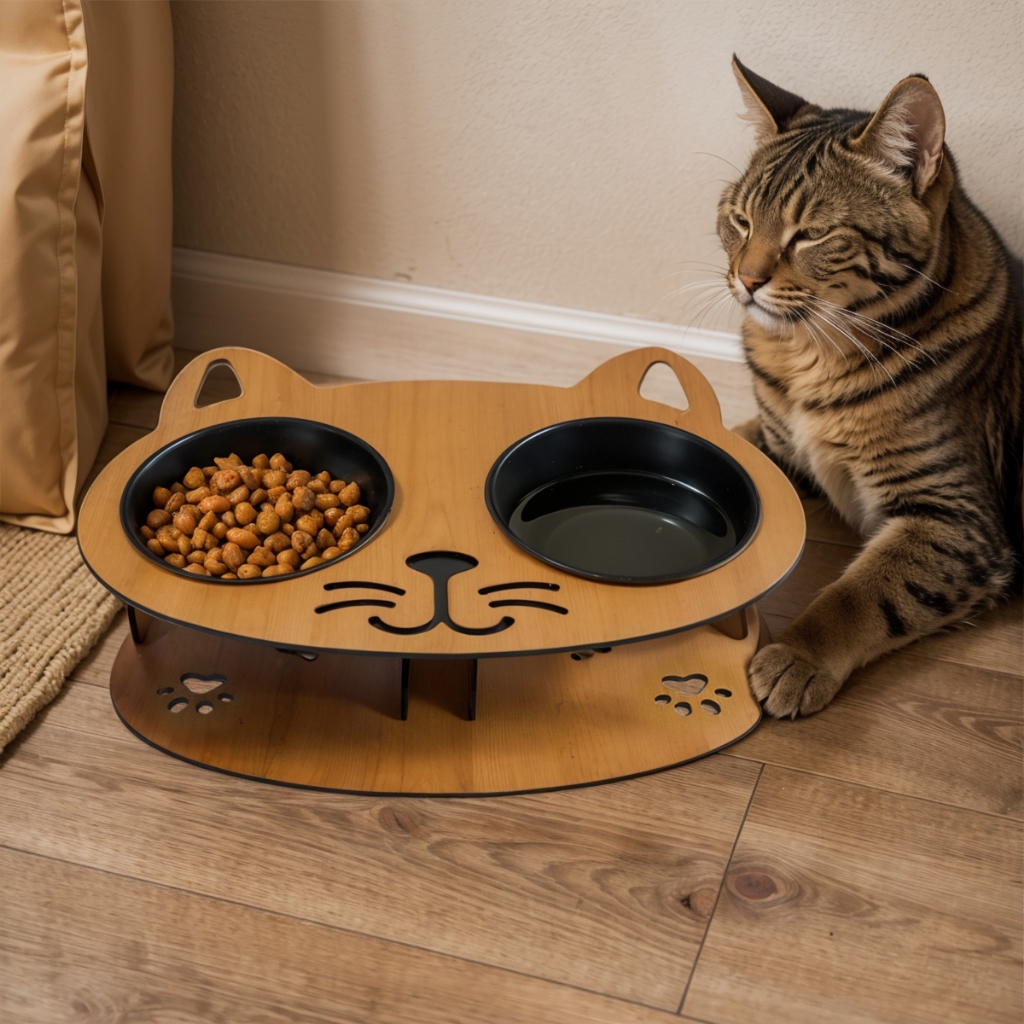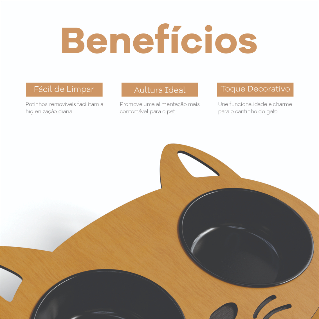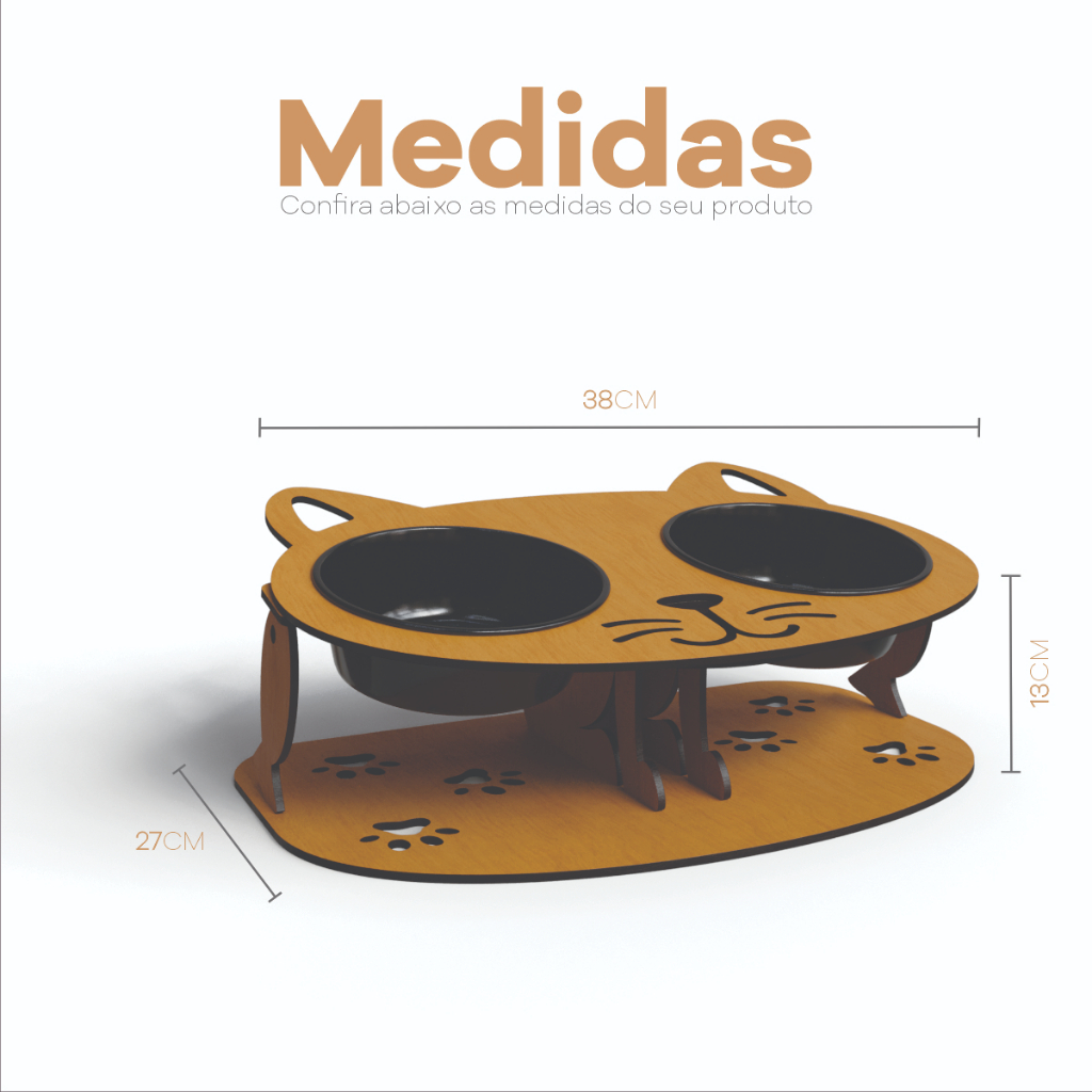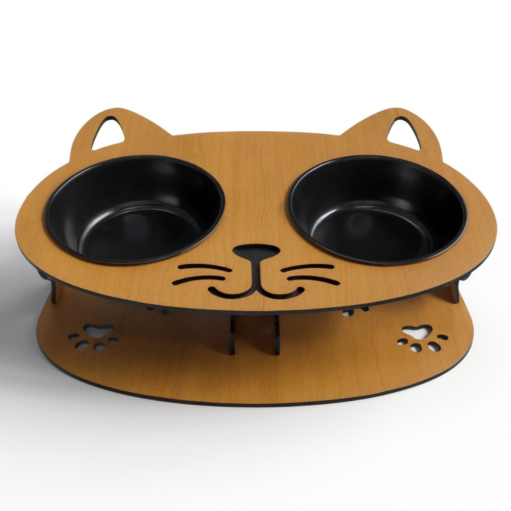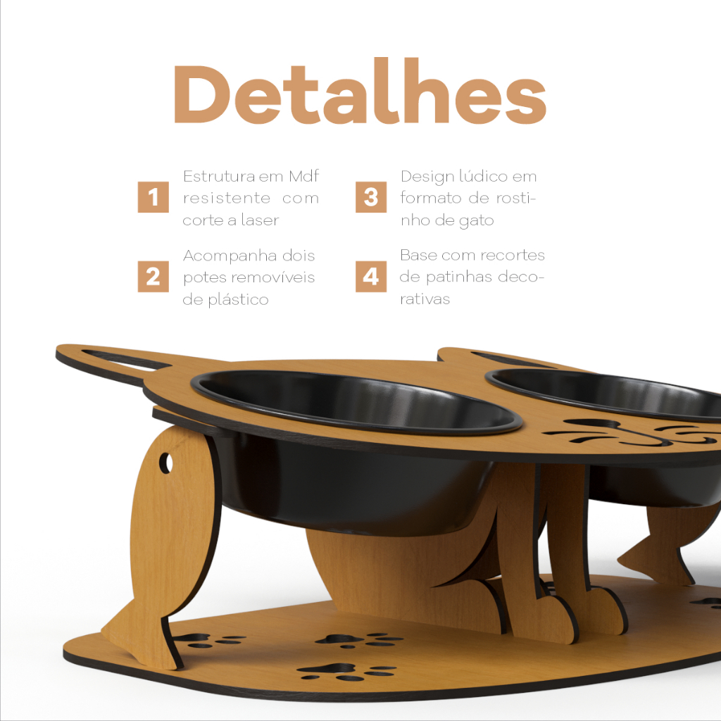 Comedouro Bebedouro Gato MDF 4mm Elevado Cor Caramelo Tabaco Potes Duráveis Alumínio ou BPA Free