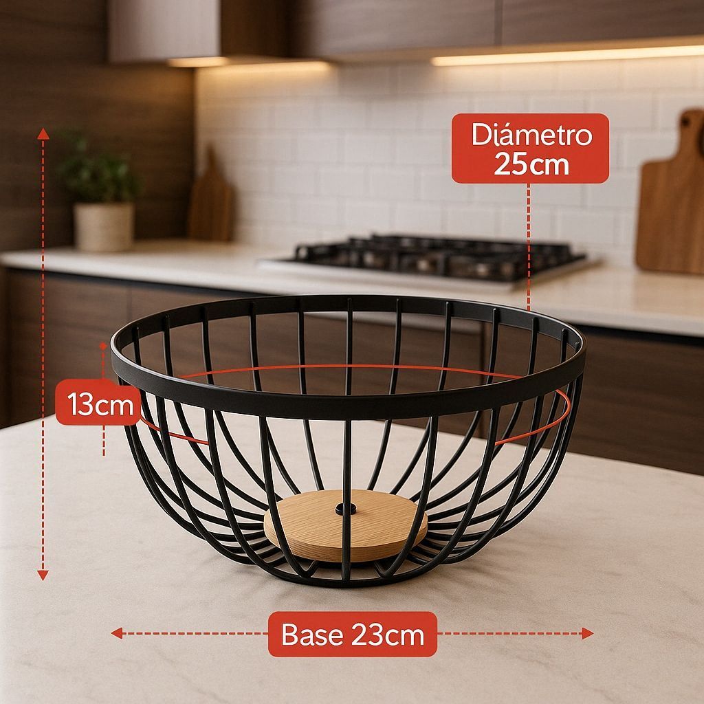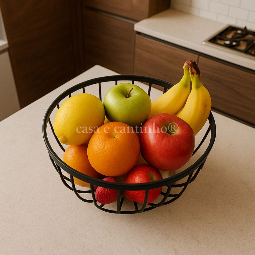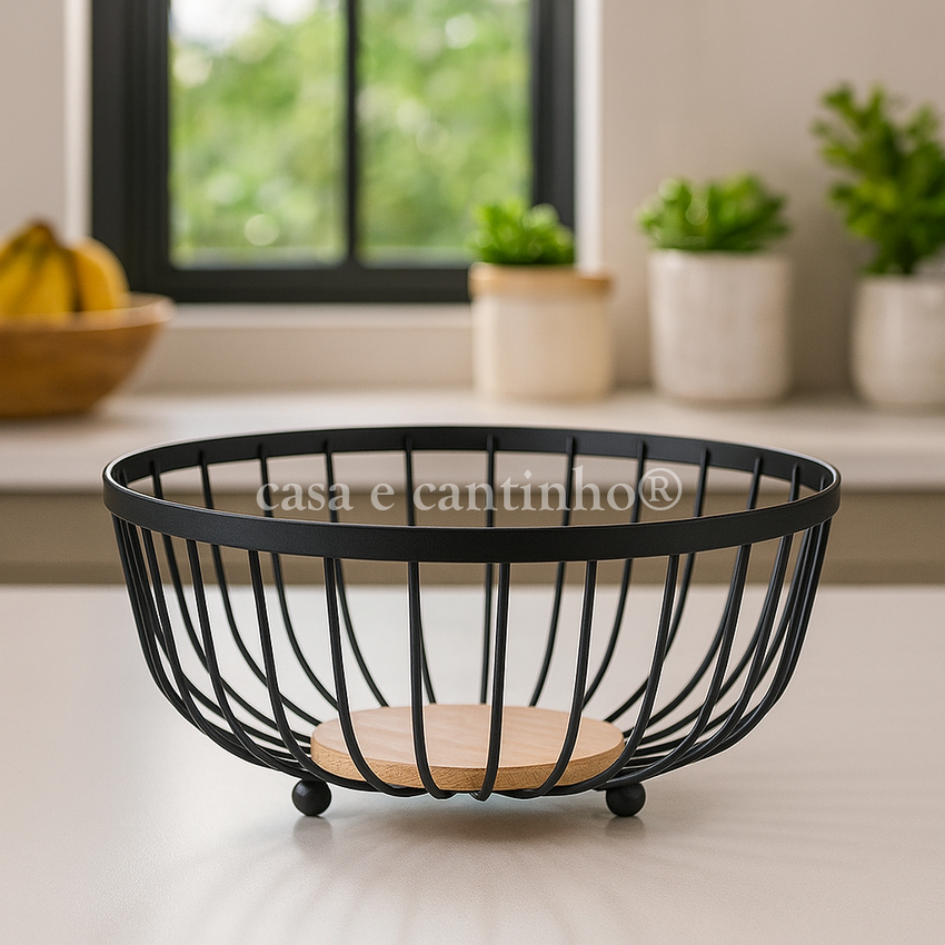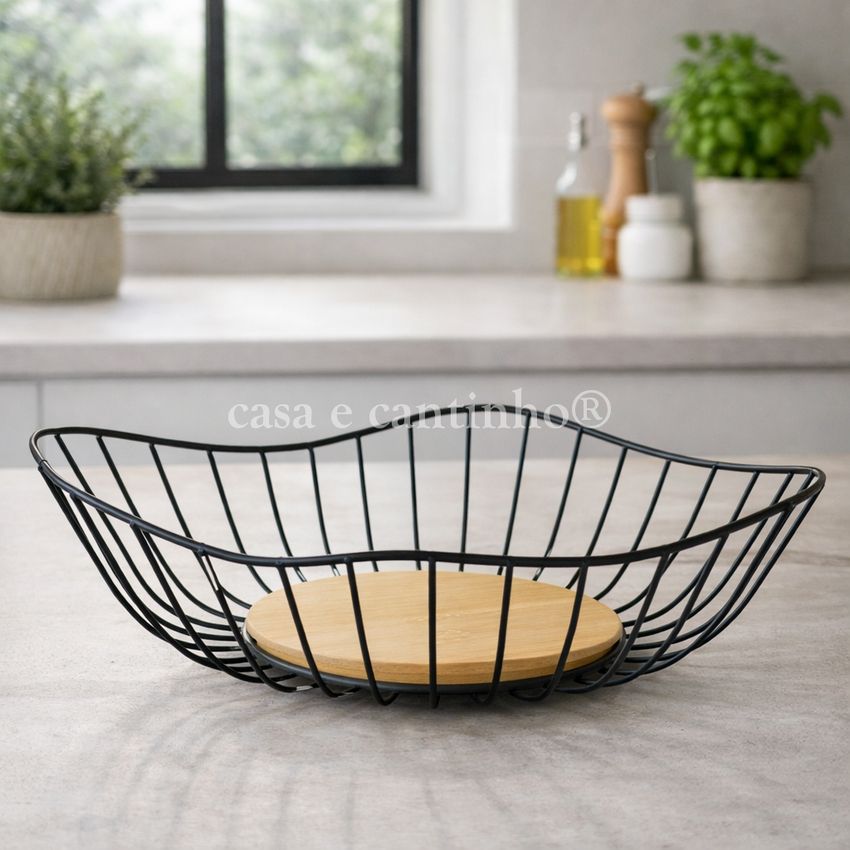 Fruteira de Mesa Rustica de Ferro e Bambu para Café da Manhã de Metal Preto Multiuso