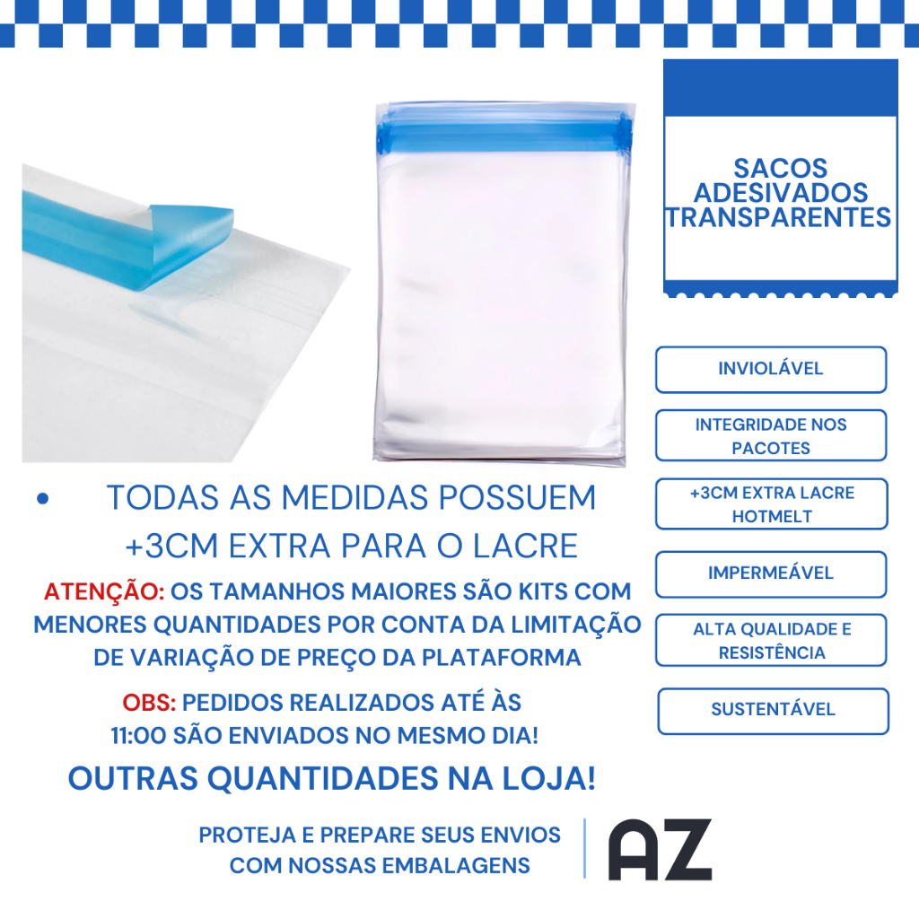 Kit 100 Sacos Adesivados Transparentes 4x4 6x9 6x12 7x7 8x8 8x12 9x13 10x15 12x18 15x15 15x20 30x40 35x45 45x45 50x70