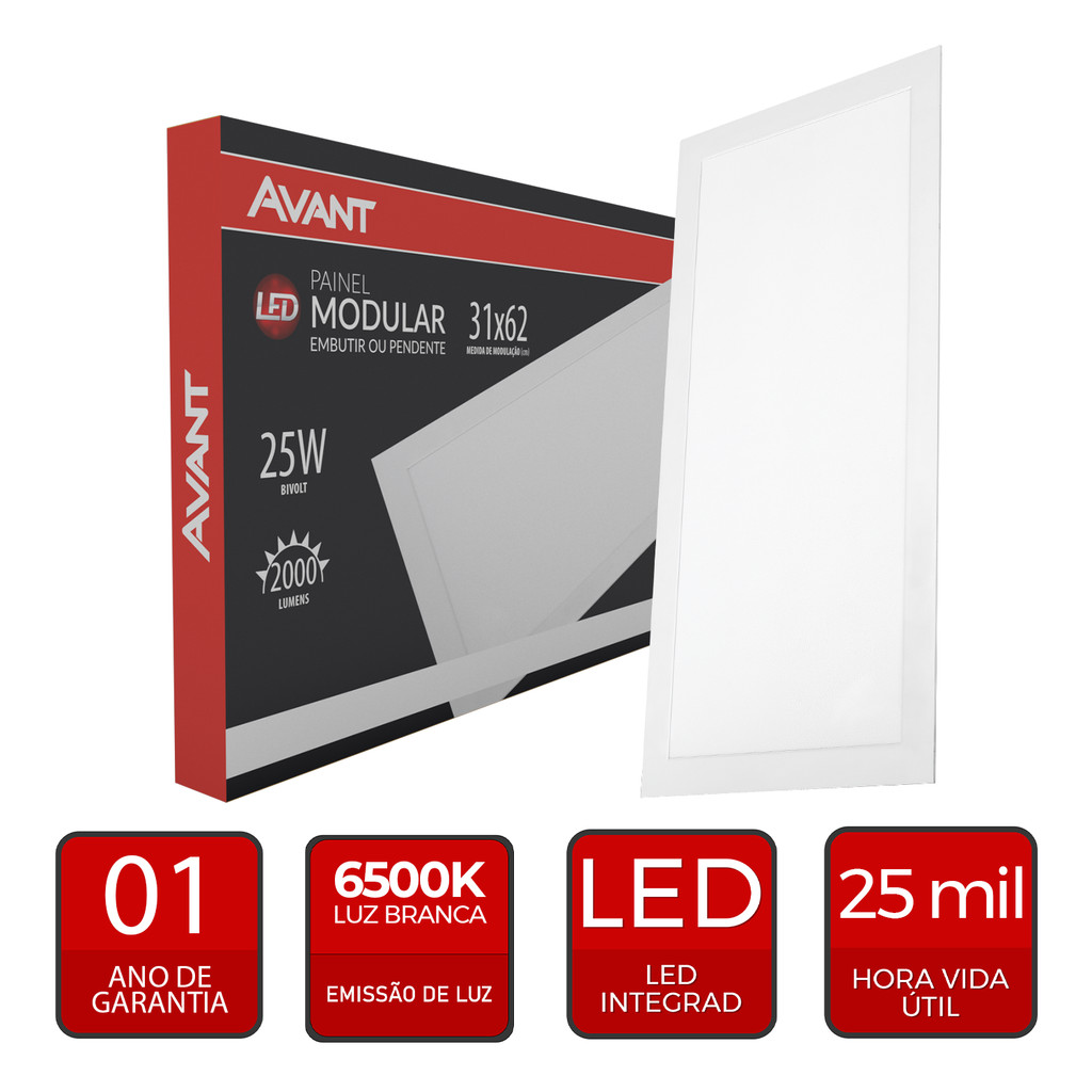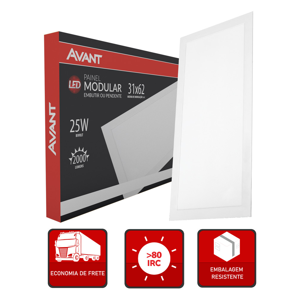 Painel Led Modular 62cm 25w 6500K Embutir ou Pendente Avant