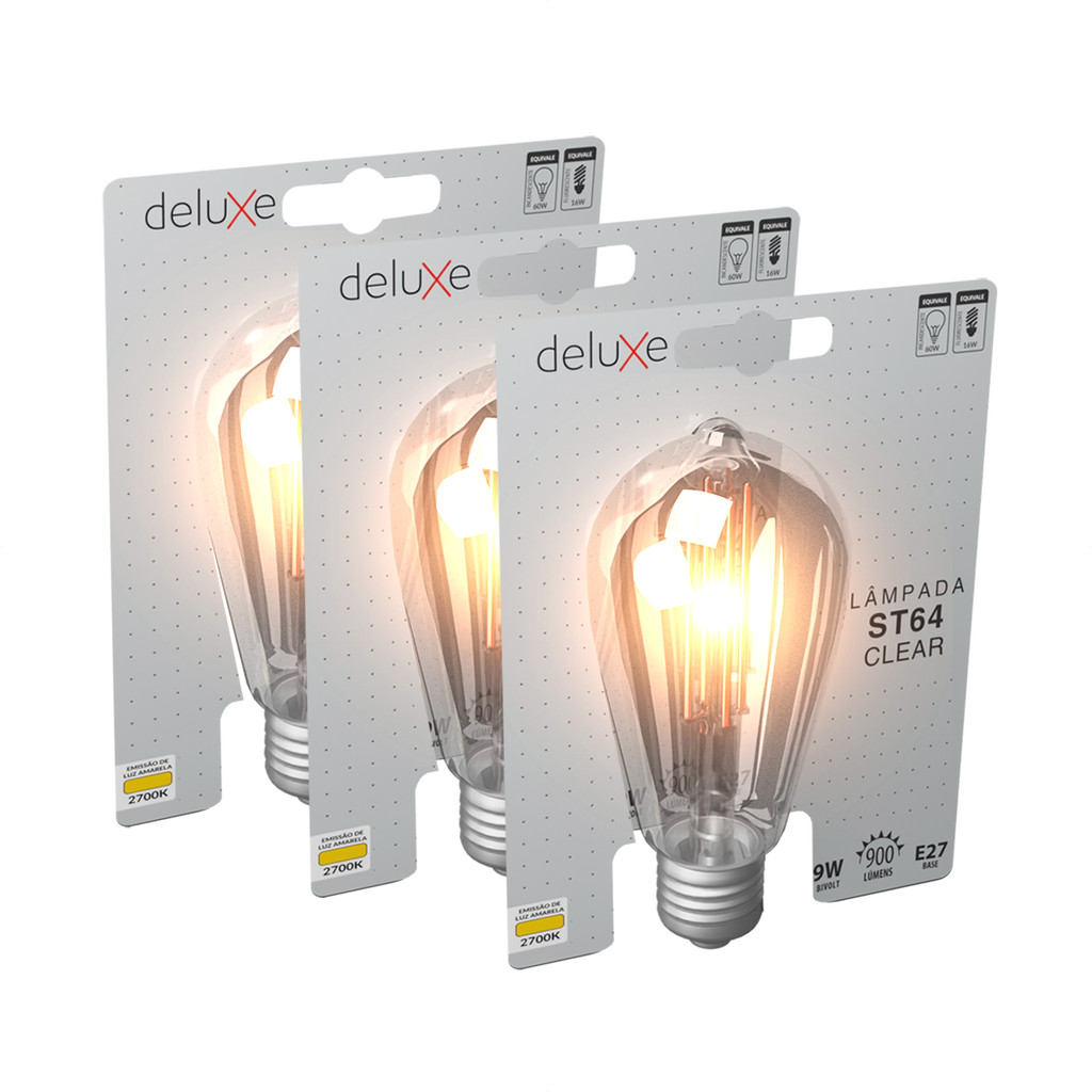 Kit 3 Lâmpadas de Led Filamento Vintage Retro ST64 Clear 9w E27 2700k Bivolt Luz Quente