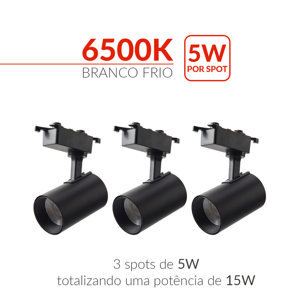 Kit trilho Eletrificado 3 Spot Led + 1 Metro de Trilho Pop 15w 6500k Branco Frio 110v/220v Preto Cod: 251931414