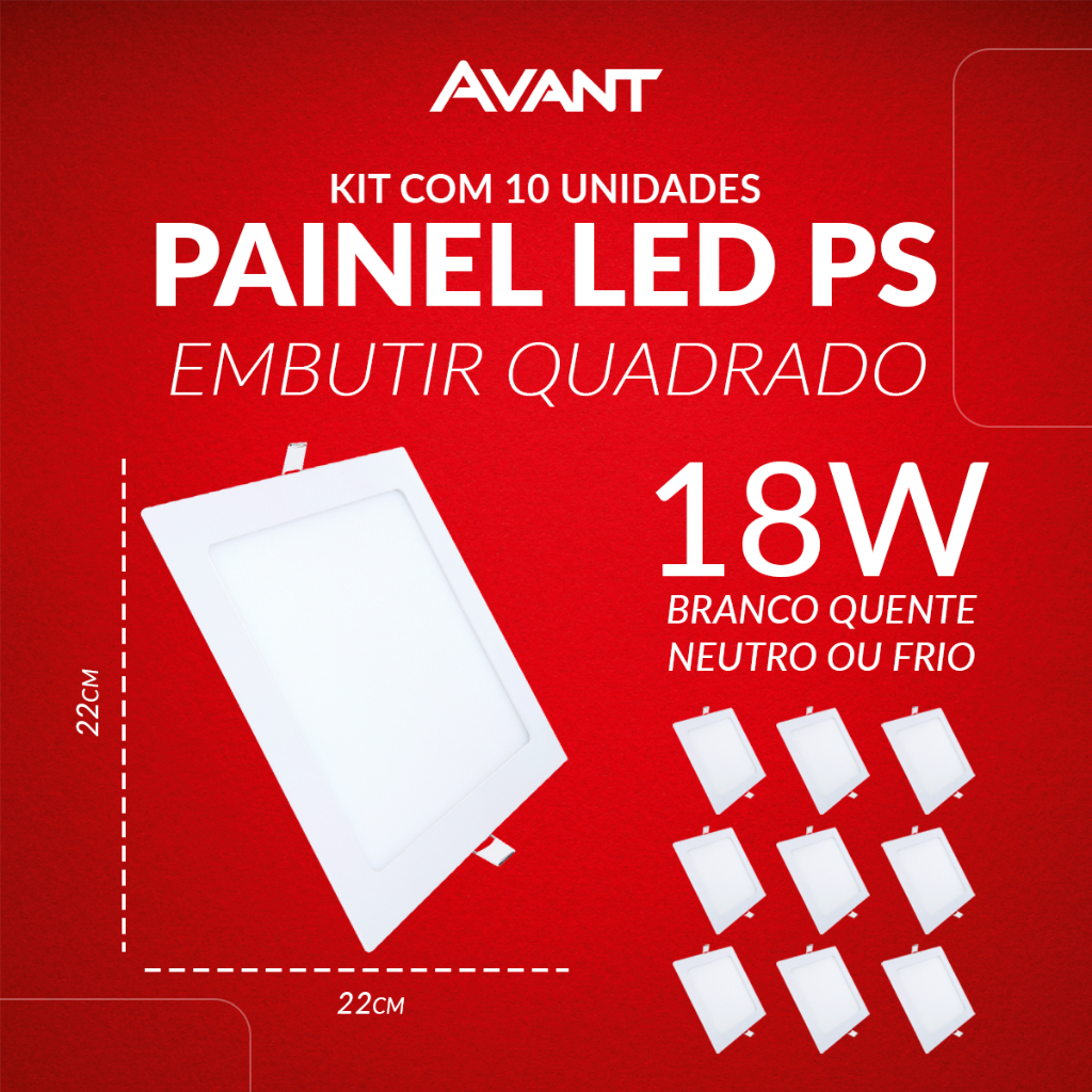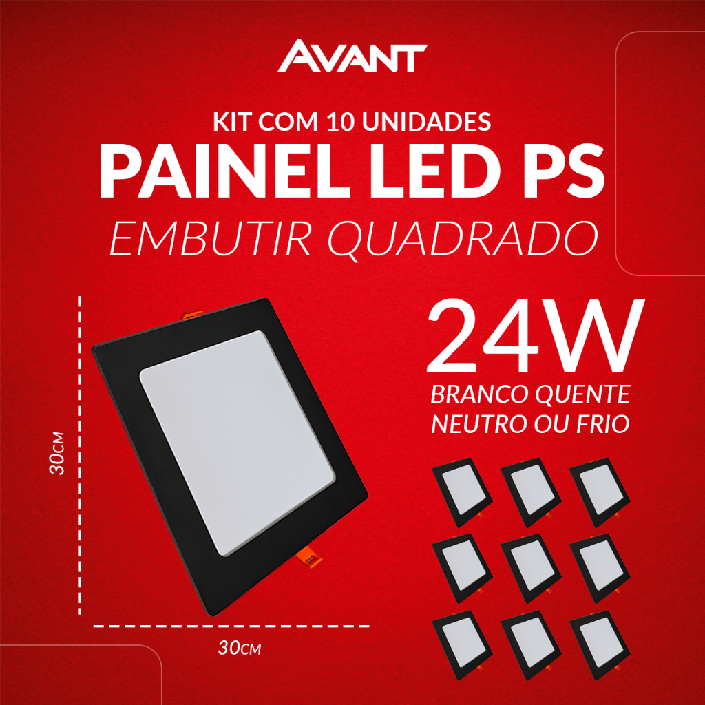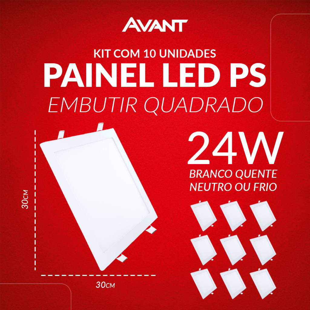 Kit 10 Painel led Plafon Pop Embutir 12w, 18w, 24w ou 30w 3000k, 4000k ou 6500k 110v/220v Bivolt Avant
