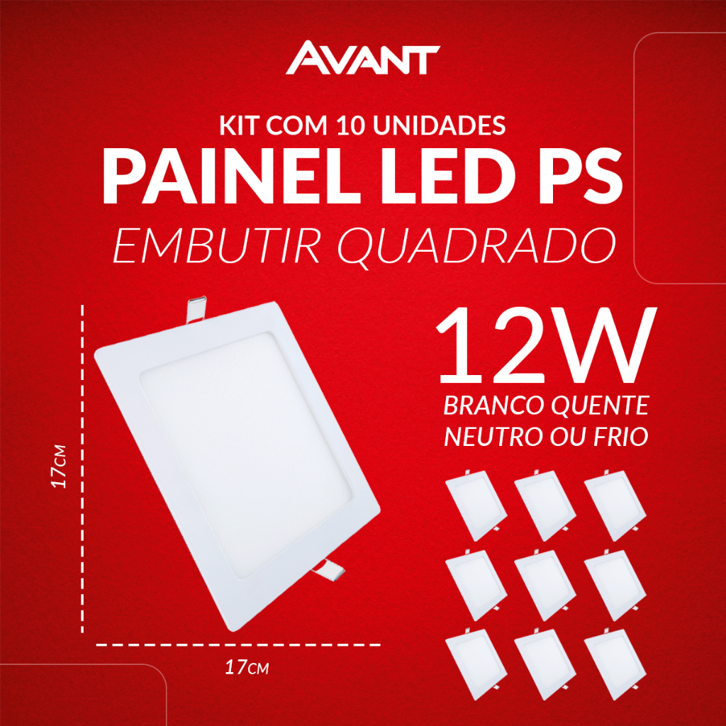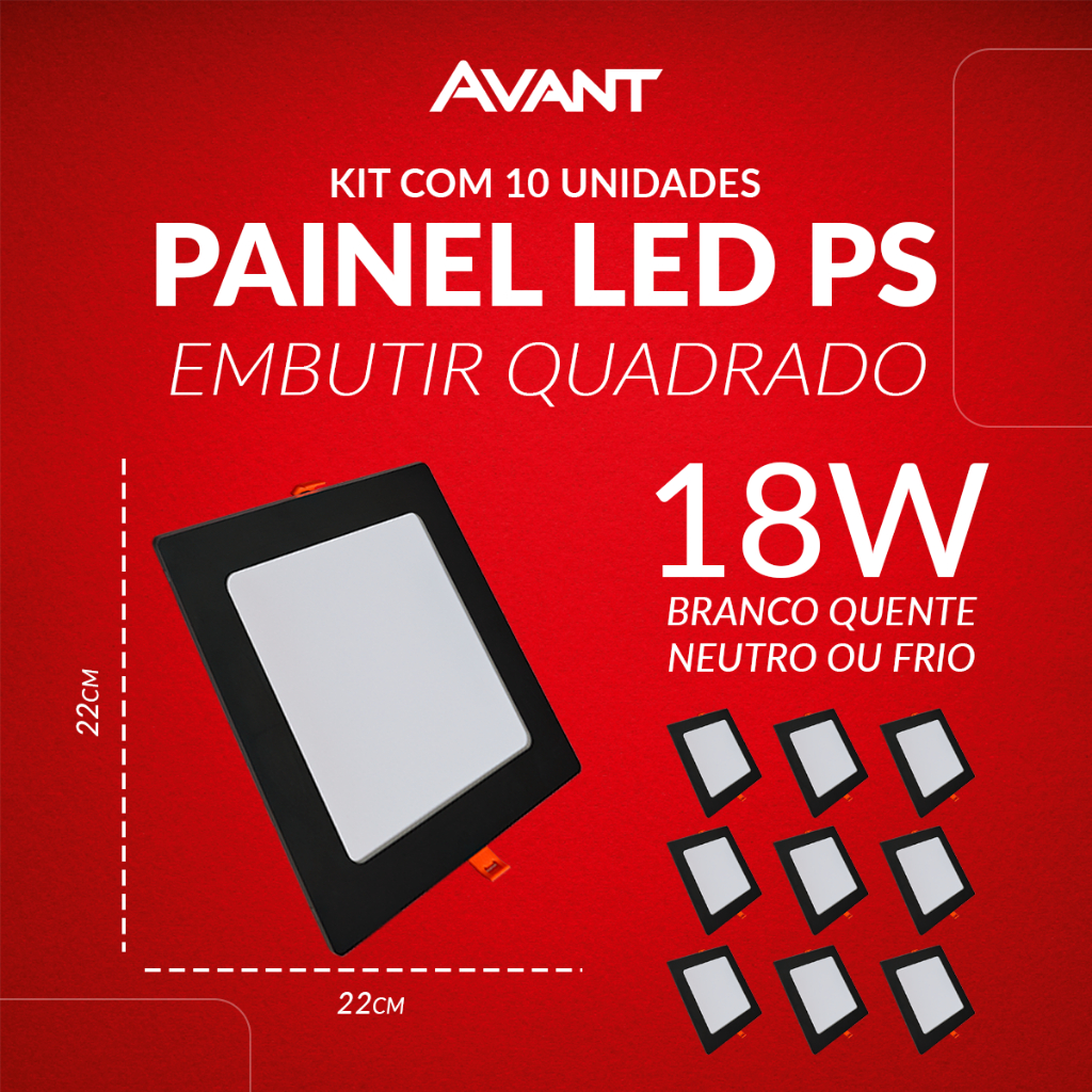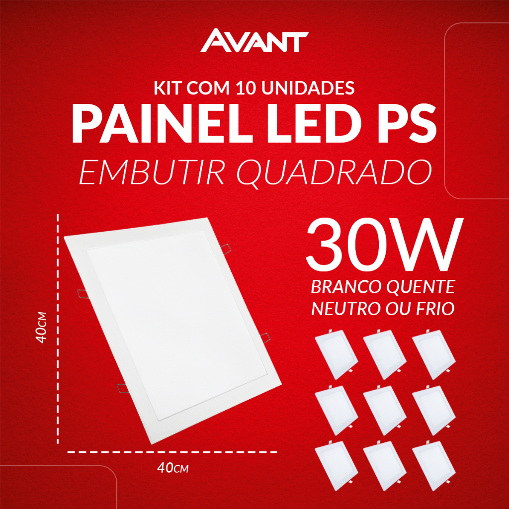 Kit 10 Painel led Plafon Pop Embutir 12w, 18w, 24w ou 30w 3000k, 4000k ou 6500k 110v/220v Bivolt Avant