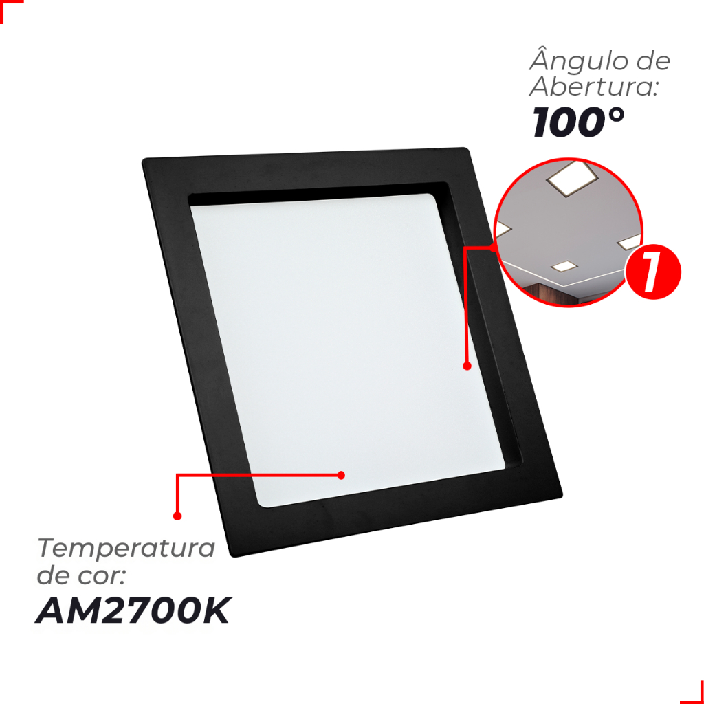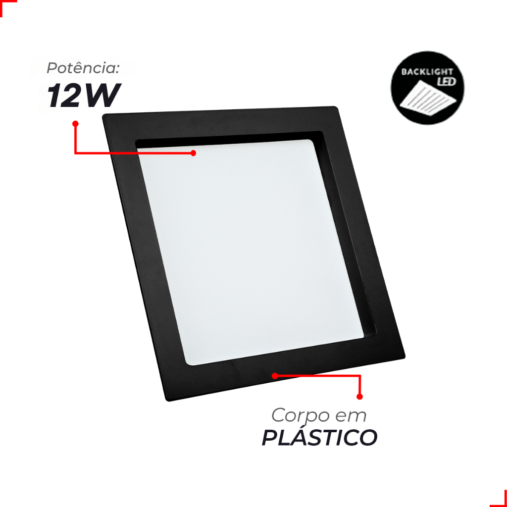 Painel Led Recuado 12w Quadrado 4000k Comfort Branco Neutro 17cm 110V/220V Bivolt Preto Fosco Cód: 908190876 - Deluxe