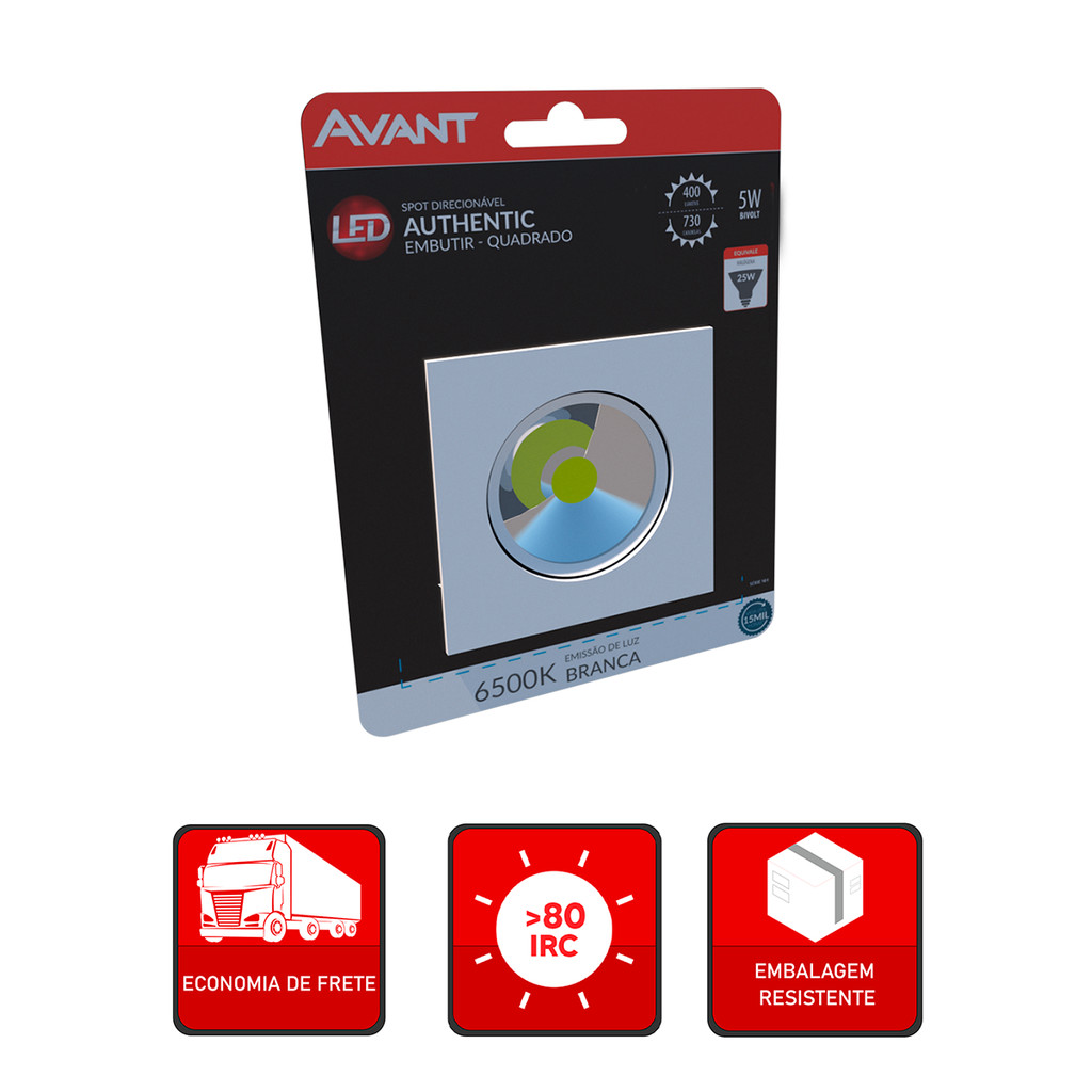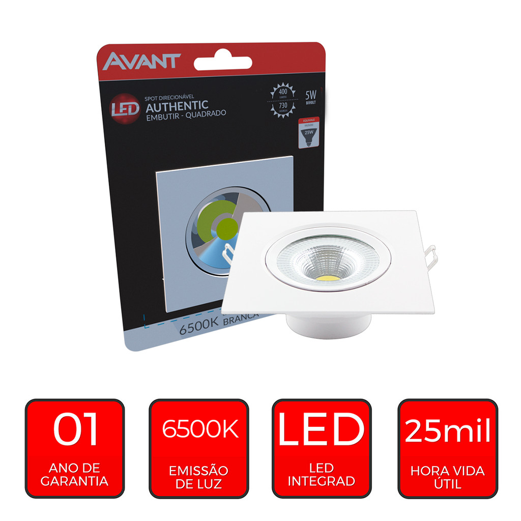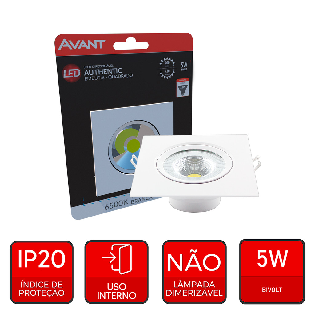 Spot Led Authentic Embutir 5w 6500k Branco Frio 9m 110v/220v Bivolt Ip20 Quadrado Branco Cod: 865031373 Avant