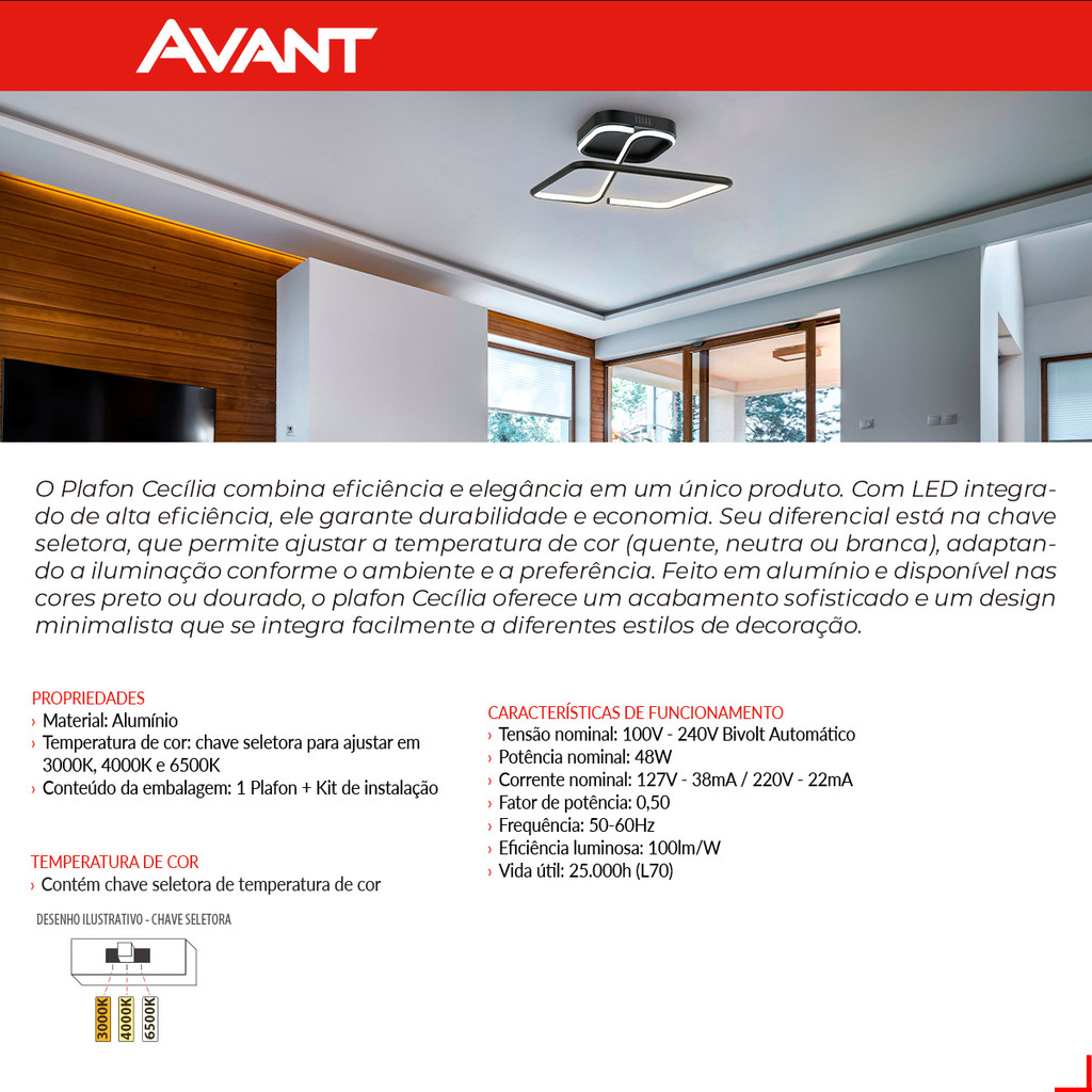 Luminaria led Plafon Cecilia 48w 3000k Branco Quente 110v/220v Bivolt Preto Cod: 589128076 Avant