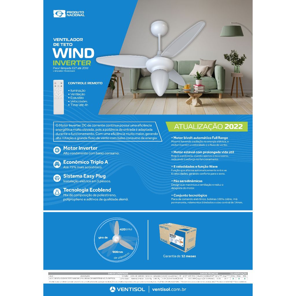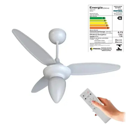 VENTILADOR TETO VENTISOL WIND INVERTER BIVOLT BRANCO | 6 VELOCIDADES | CONTROLE REMOTO