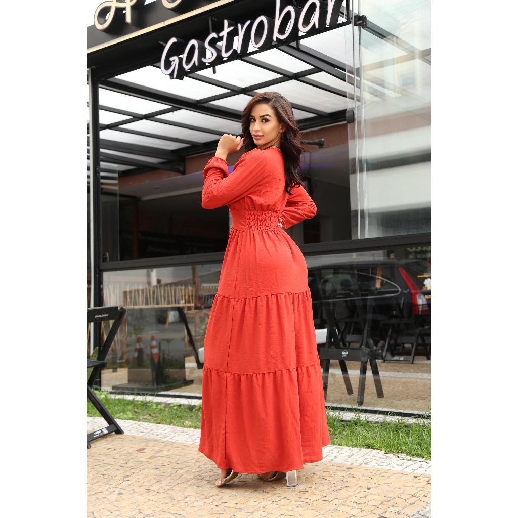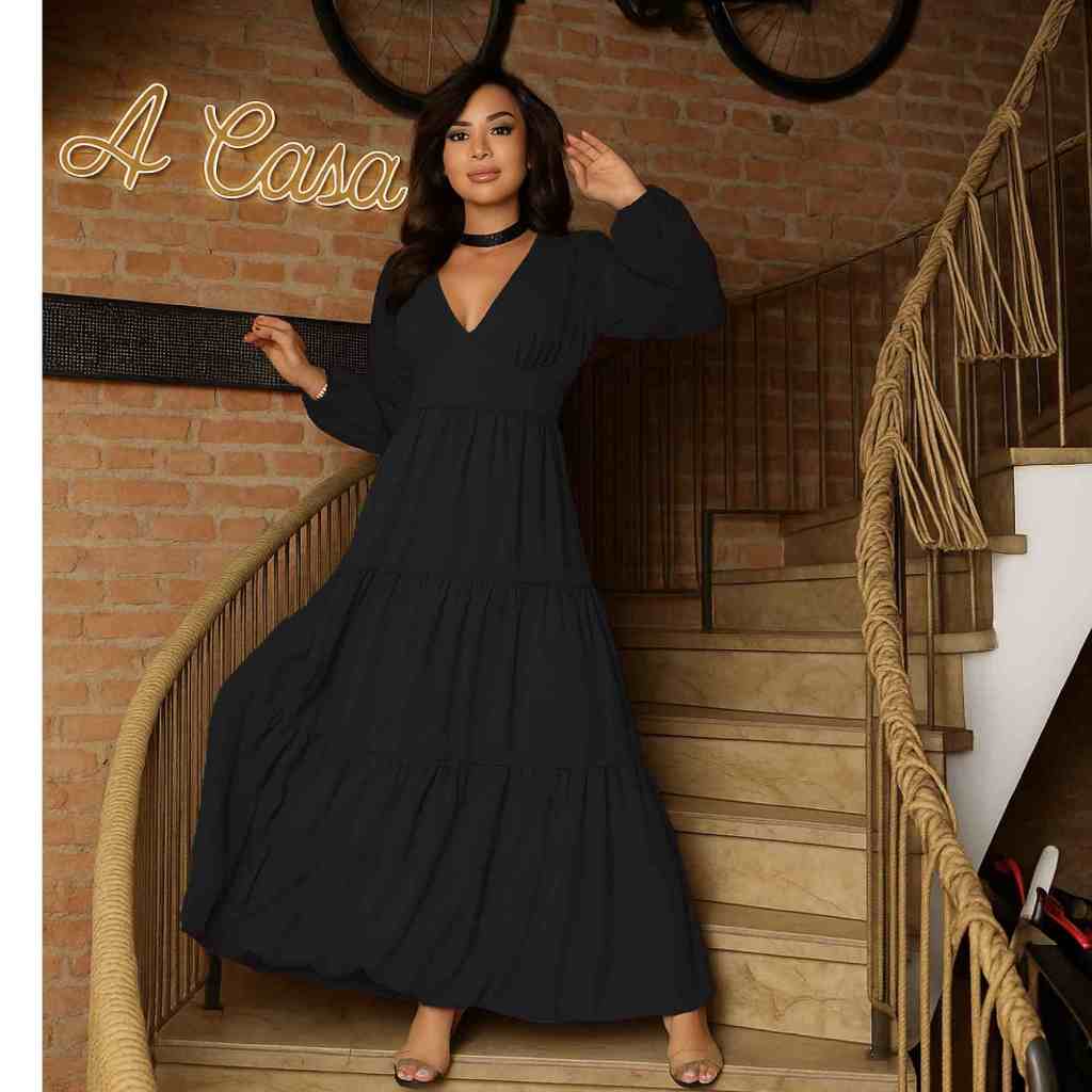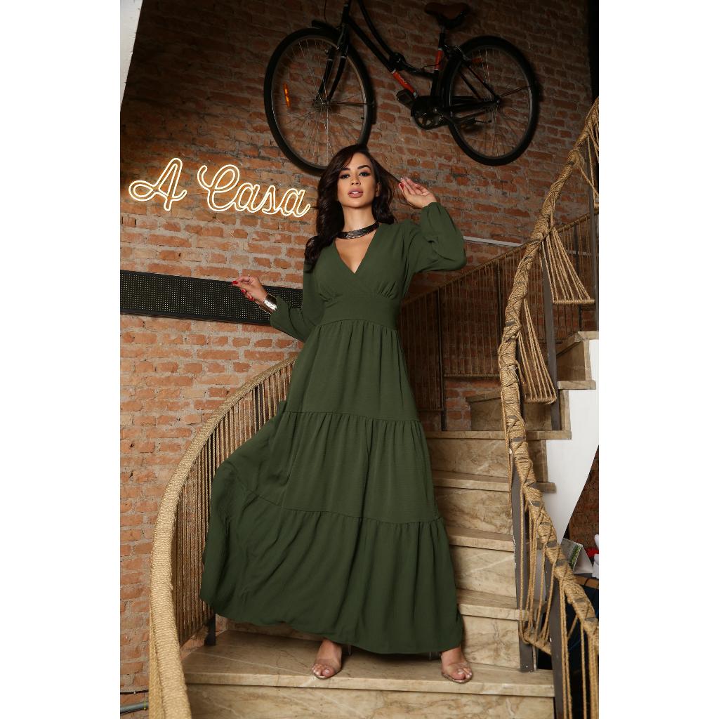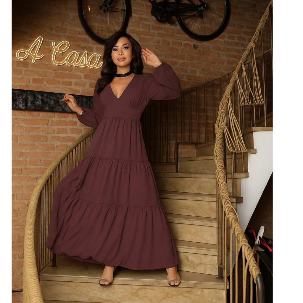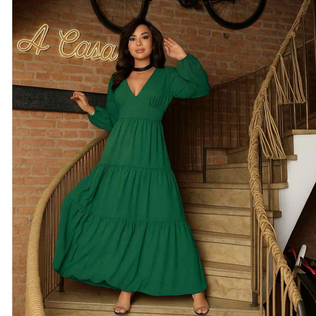 Vestido Feminino Longo decote V manga longa