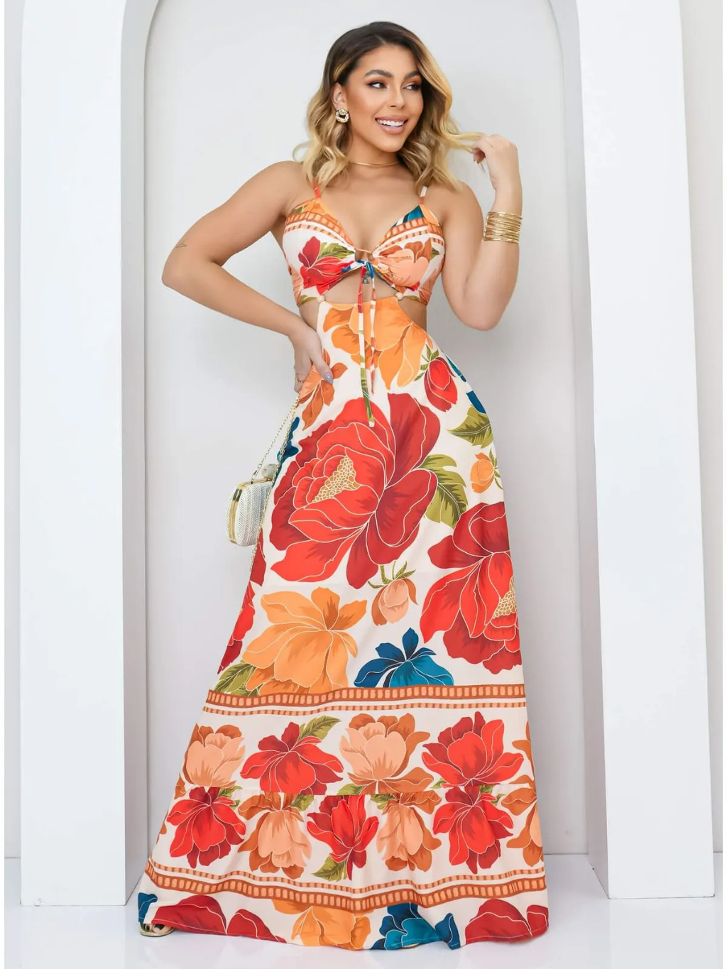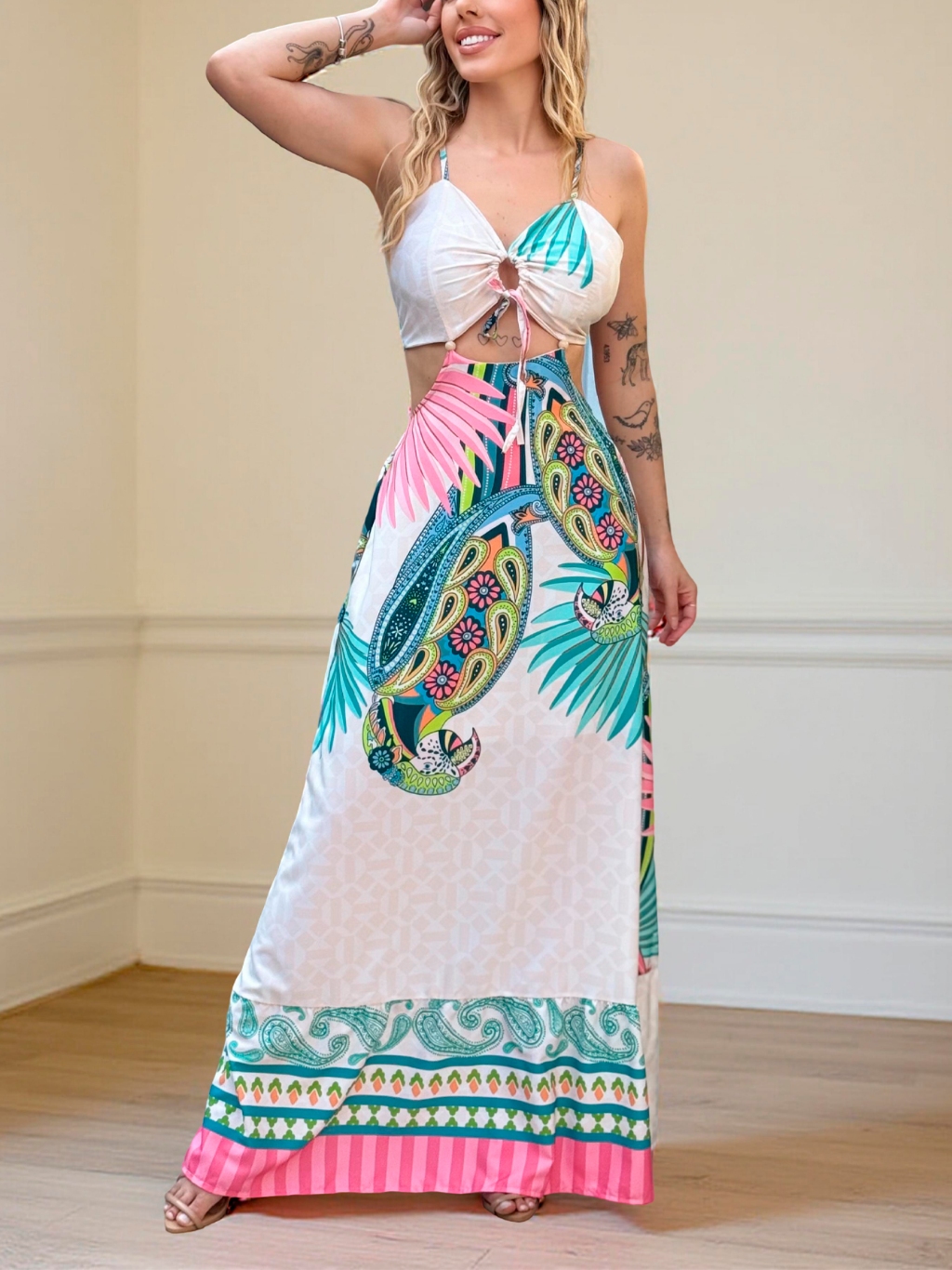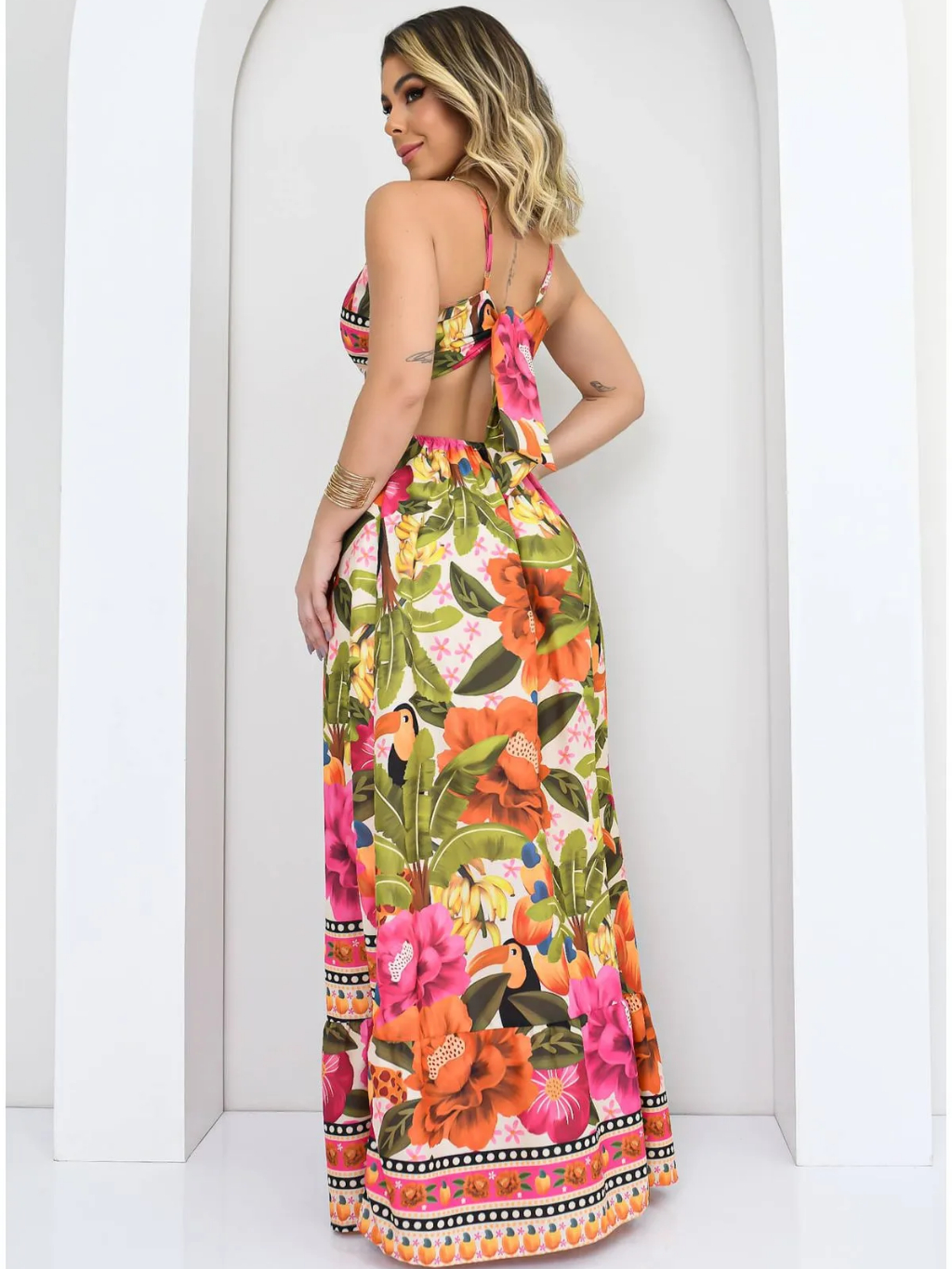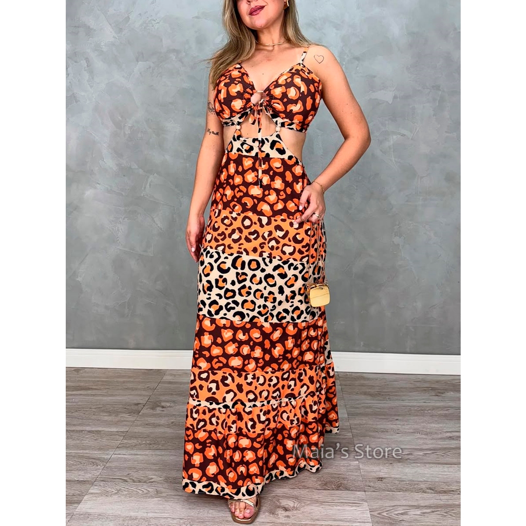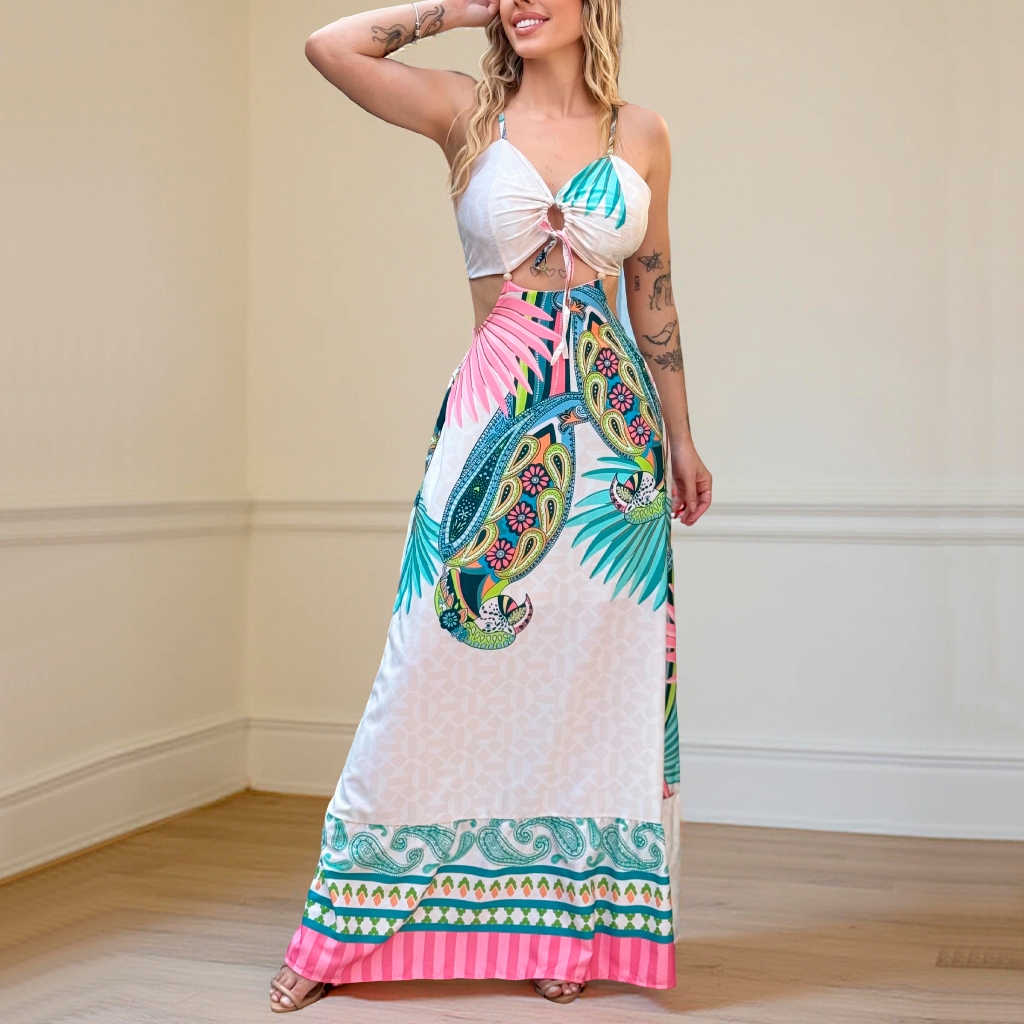 Vestido Longo feminino Decotado Costa Nua Estampa Verão Tropical