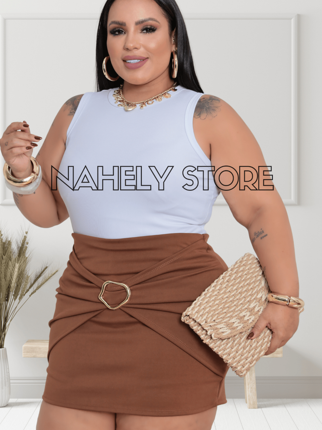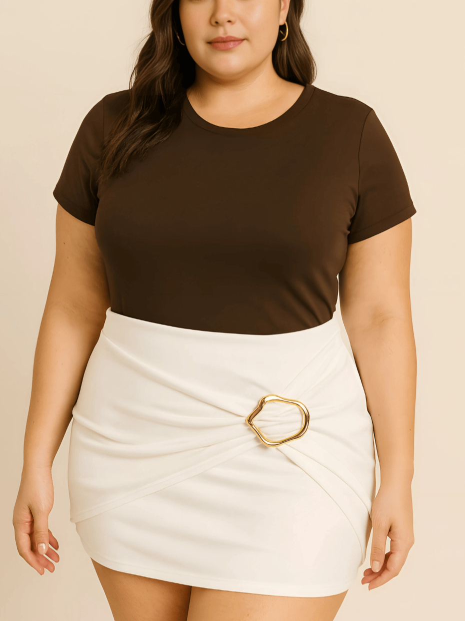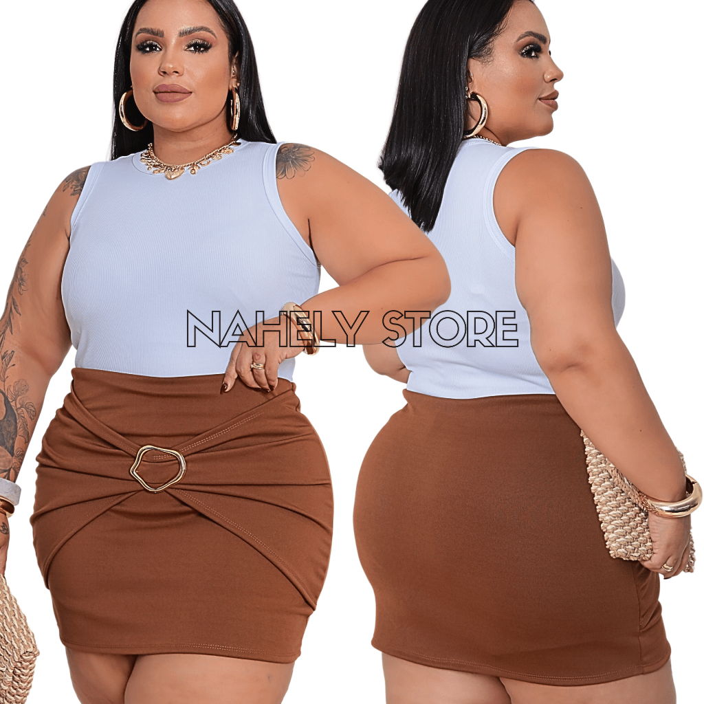 Short Saia Feminino Plus Size Neoprene com Fivela Dourada Moda Outono Inverno G1 G2 G3