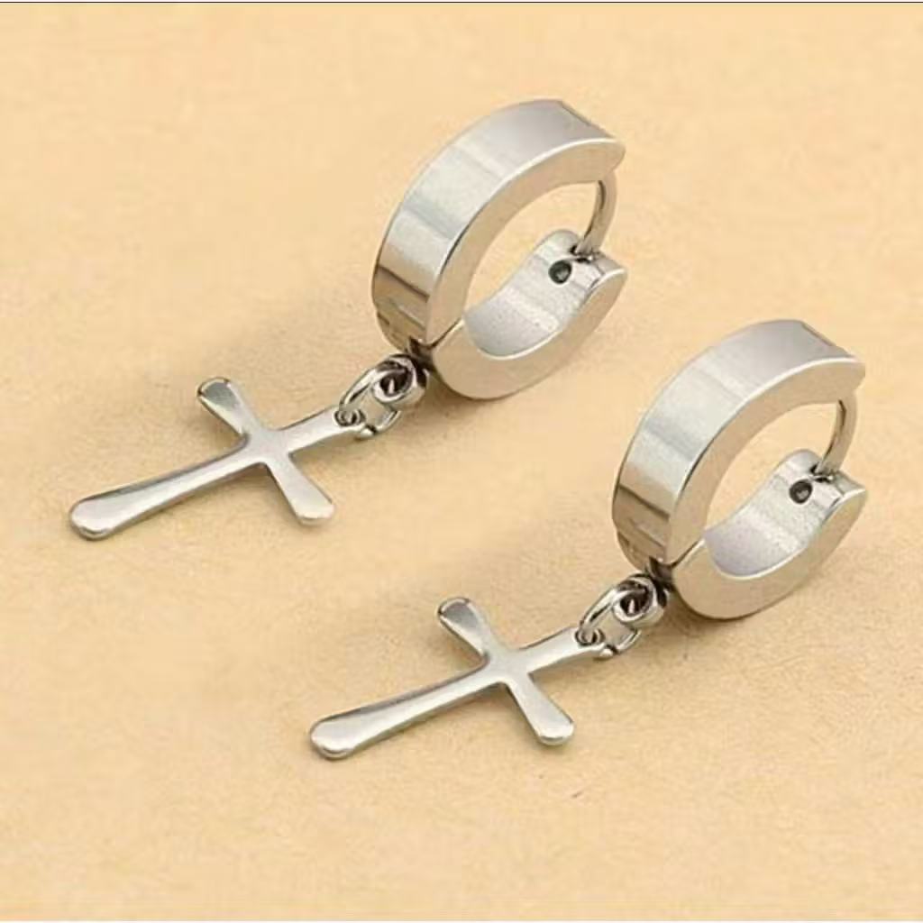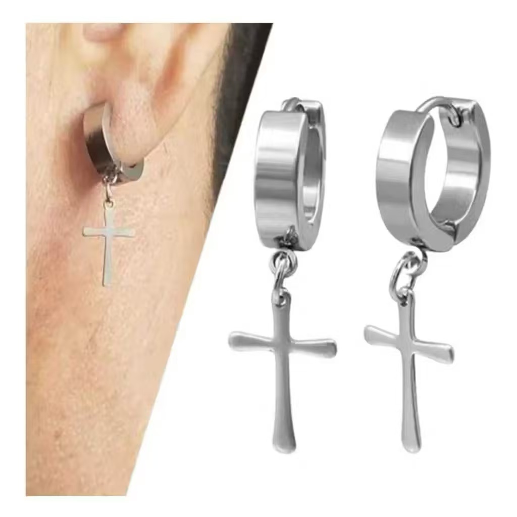Par Brinco Masculino Argola Cruz Aço Inox