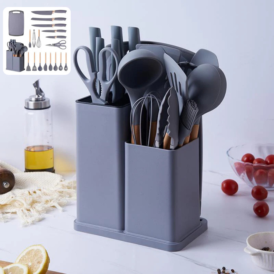 Kit Utensílios de Cozinha 12/19 Peças • Silicone com Cabo de Madeira • Completo e Resistente