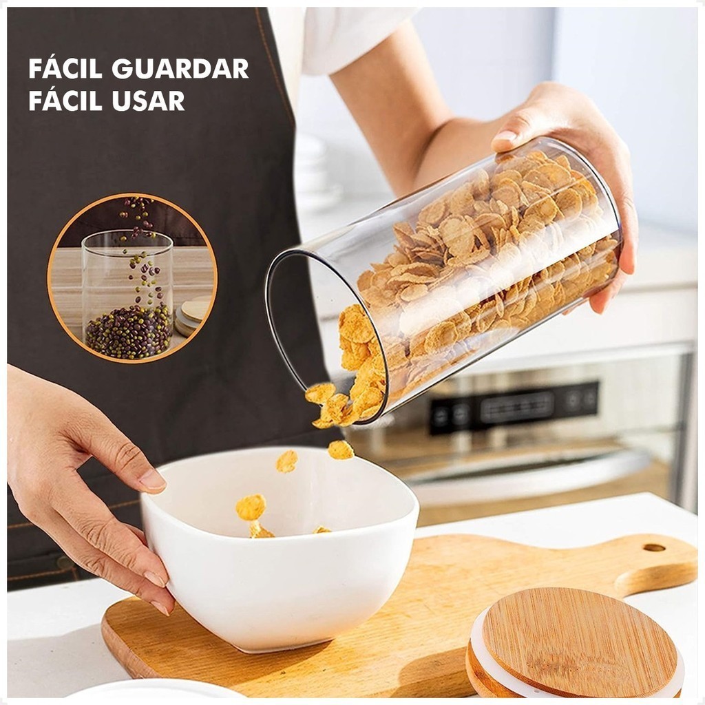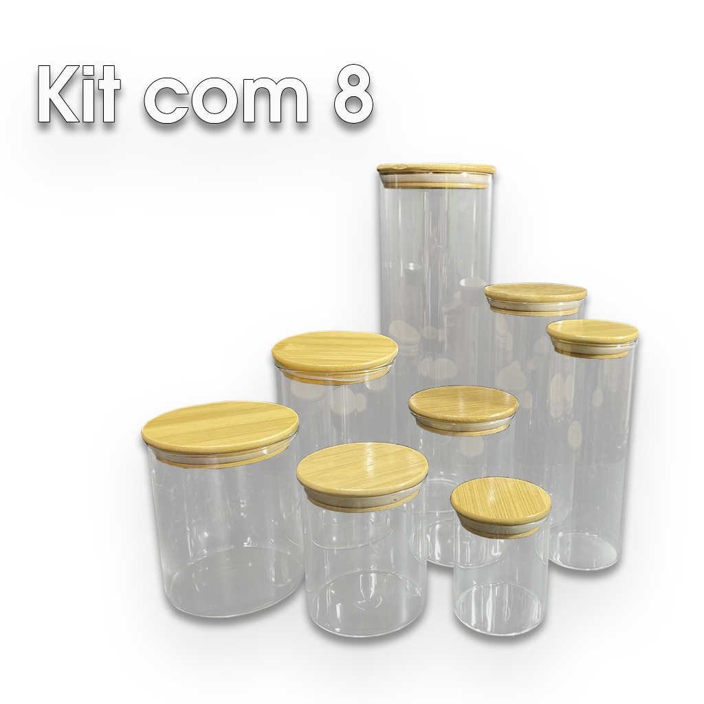 Kit 8 potes de vidro com tampa de bambu herméticos redondos