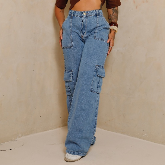 Calça Jeans Cargo Wide Feminina Moda Street Tecido Premium Bolso Lavagem Clara